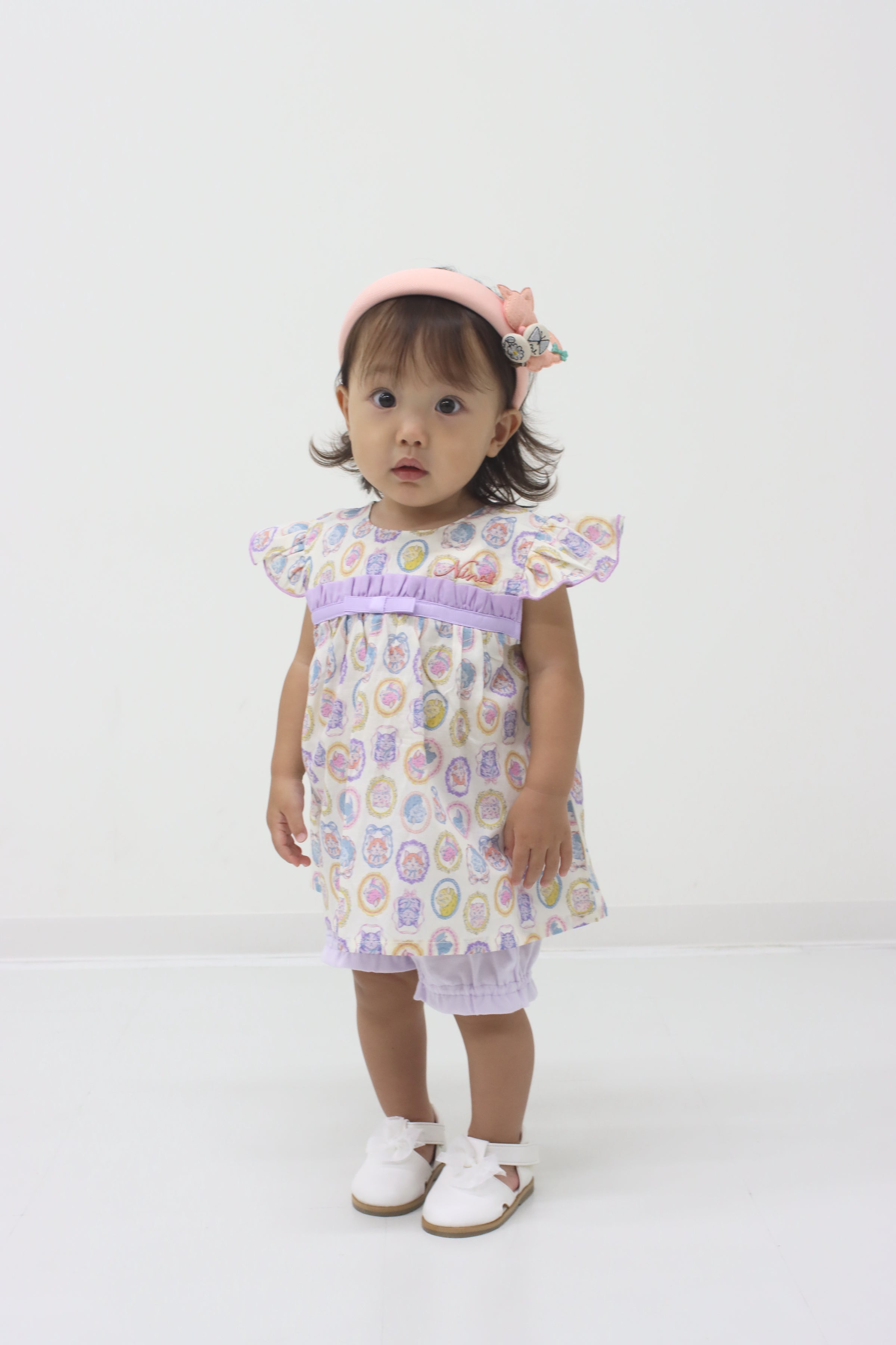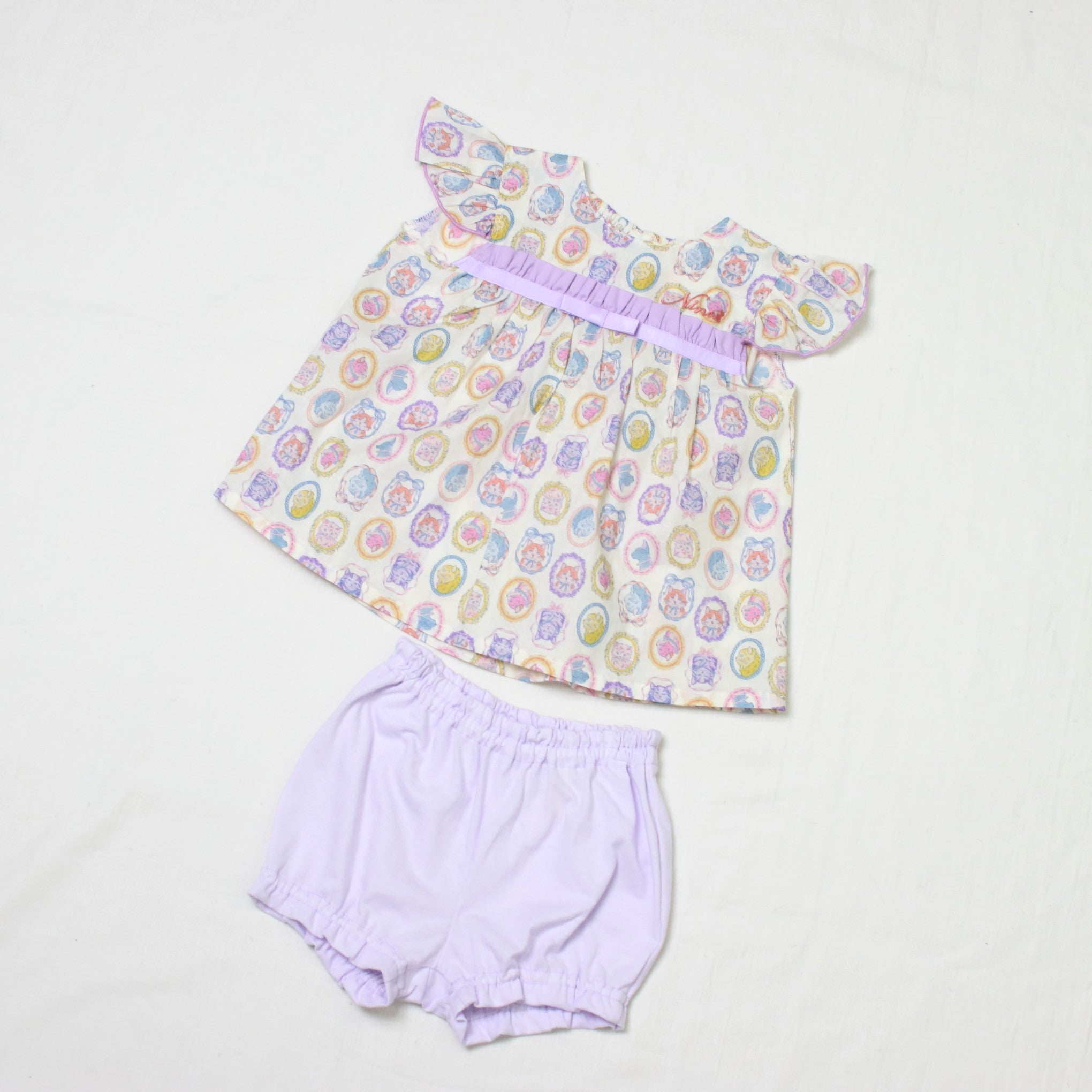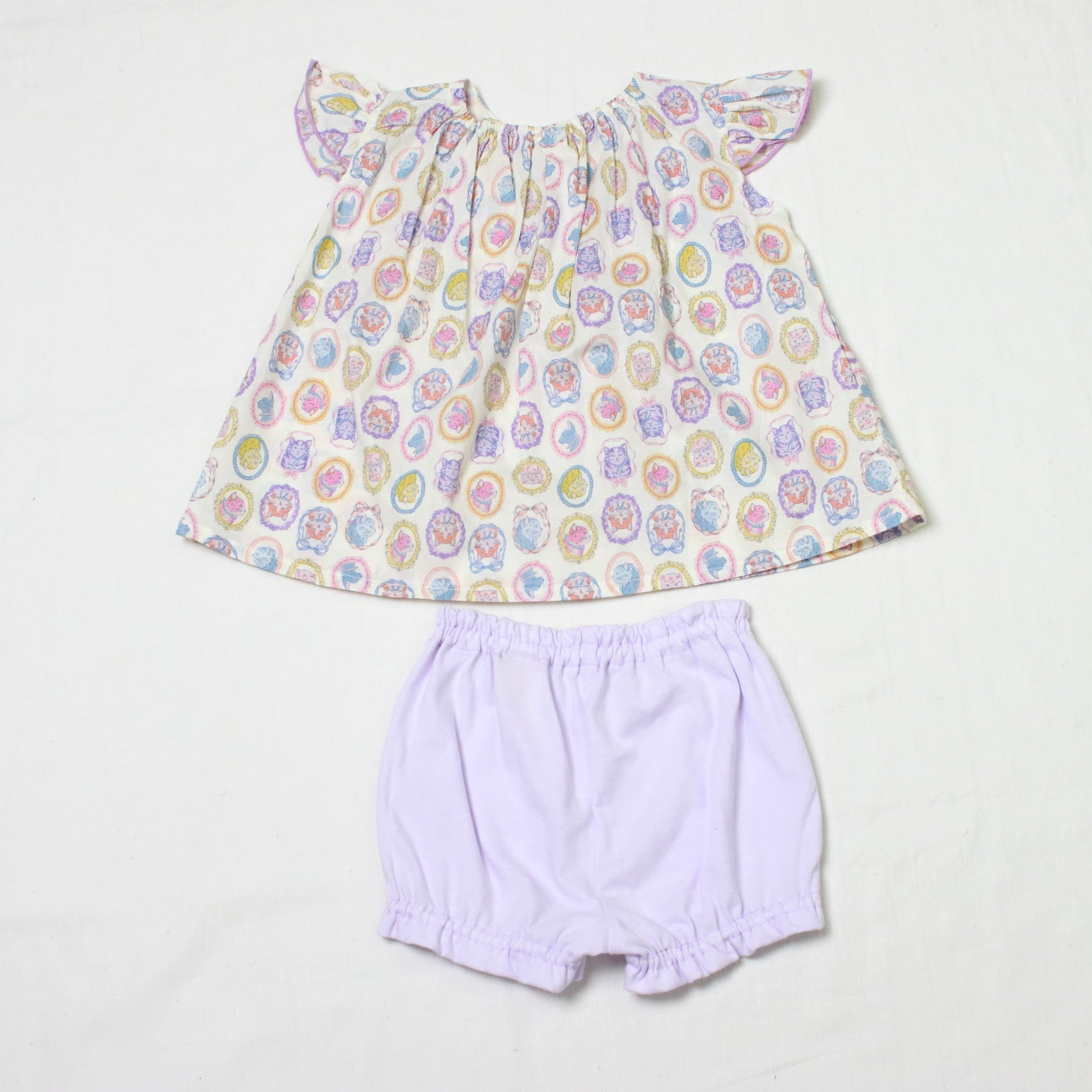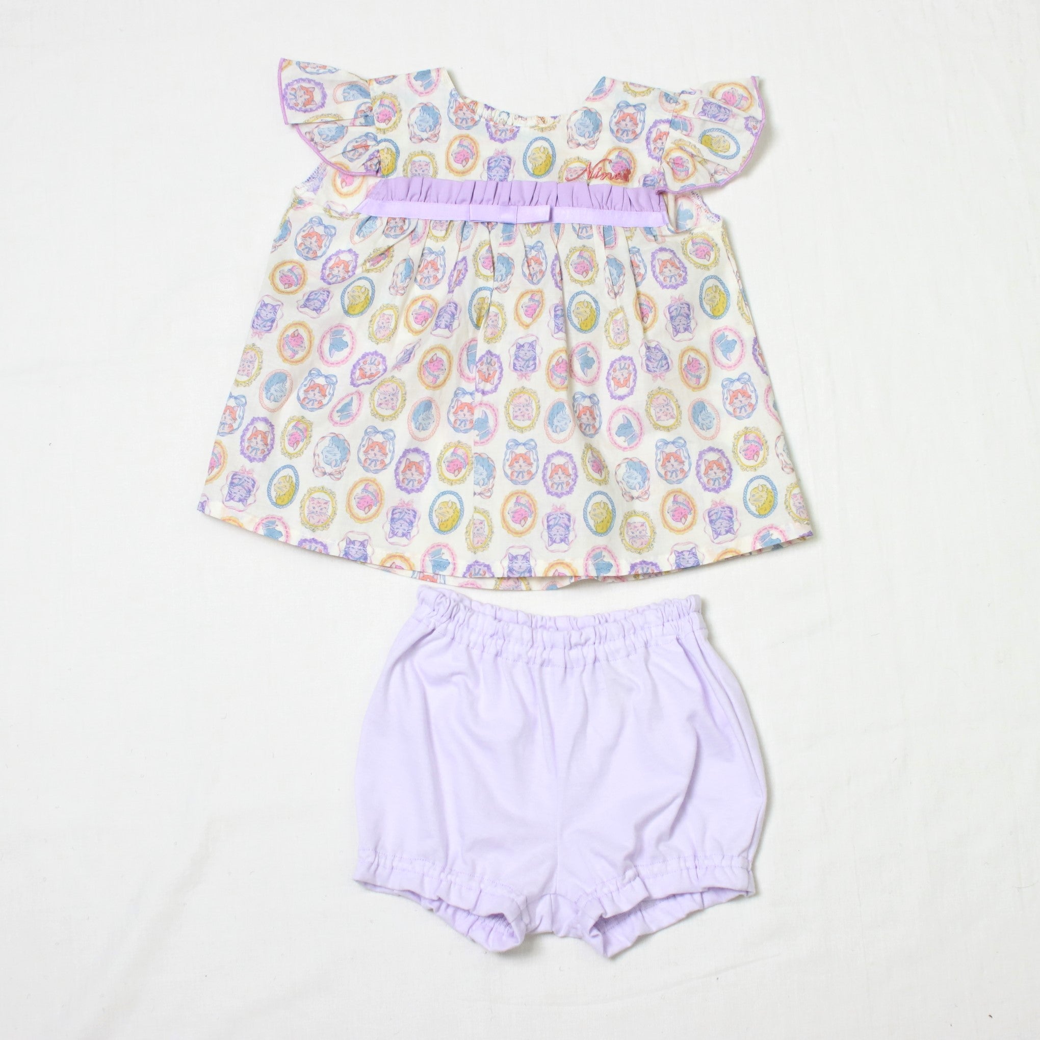 フレームに囲まれたネコちゃんモチーフがキュートで、お出かけスタイルもばっちり決まります!ブルマには伸縮性があるので、動きやすくてアクティブなベビーにもぴったり。プリント生地はややシアー感がありますので、インナーとのコーディネートも楽しめますよ。