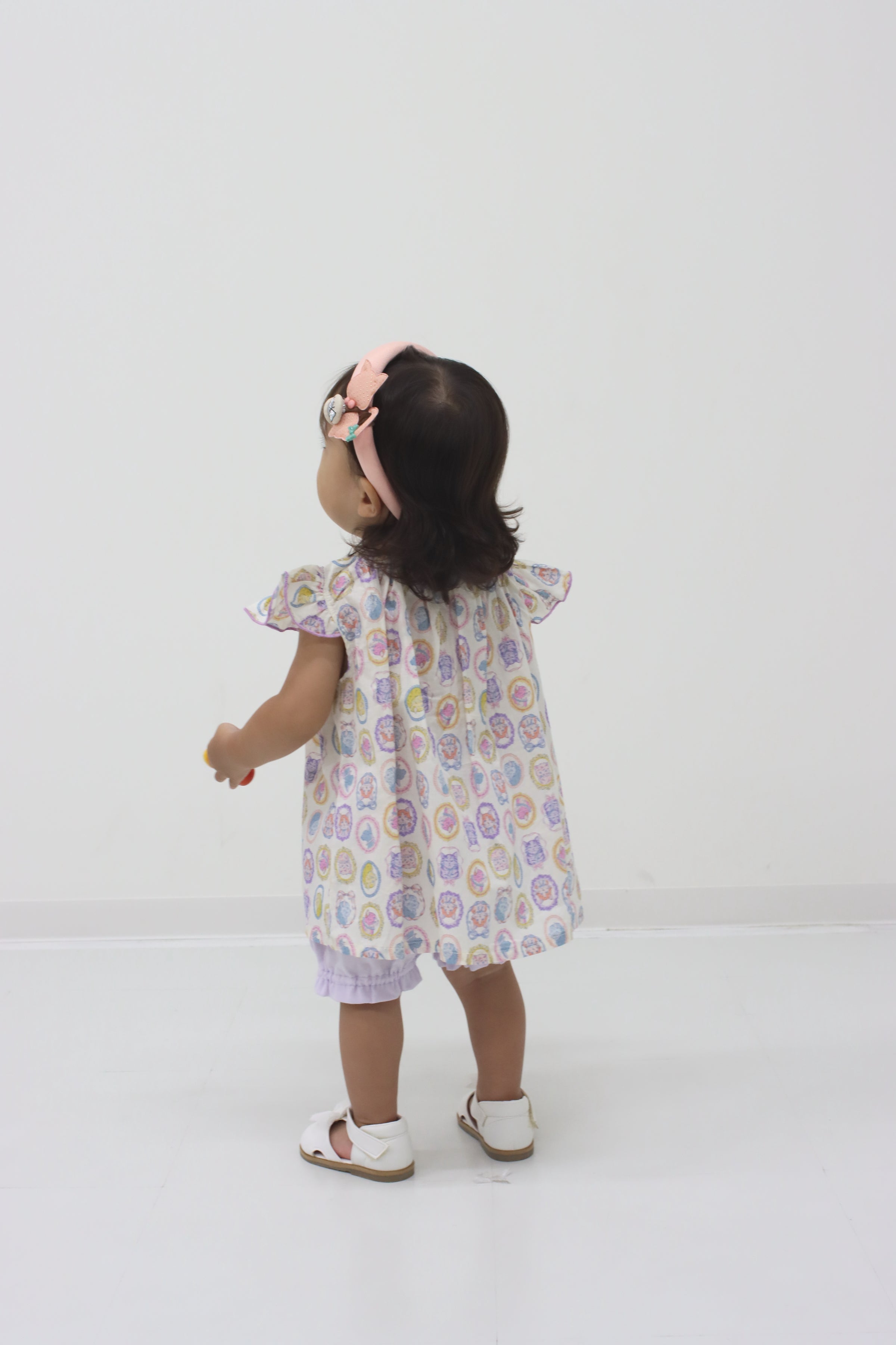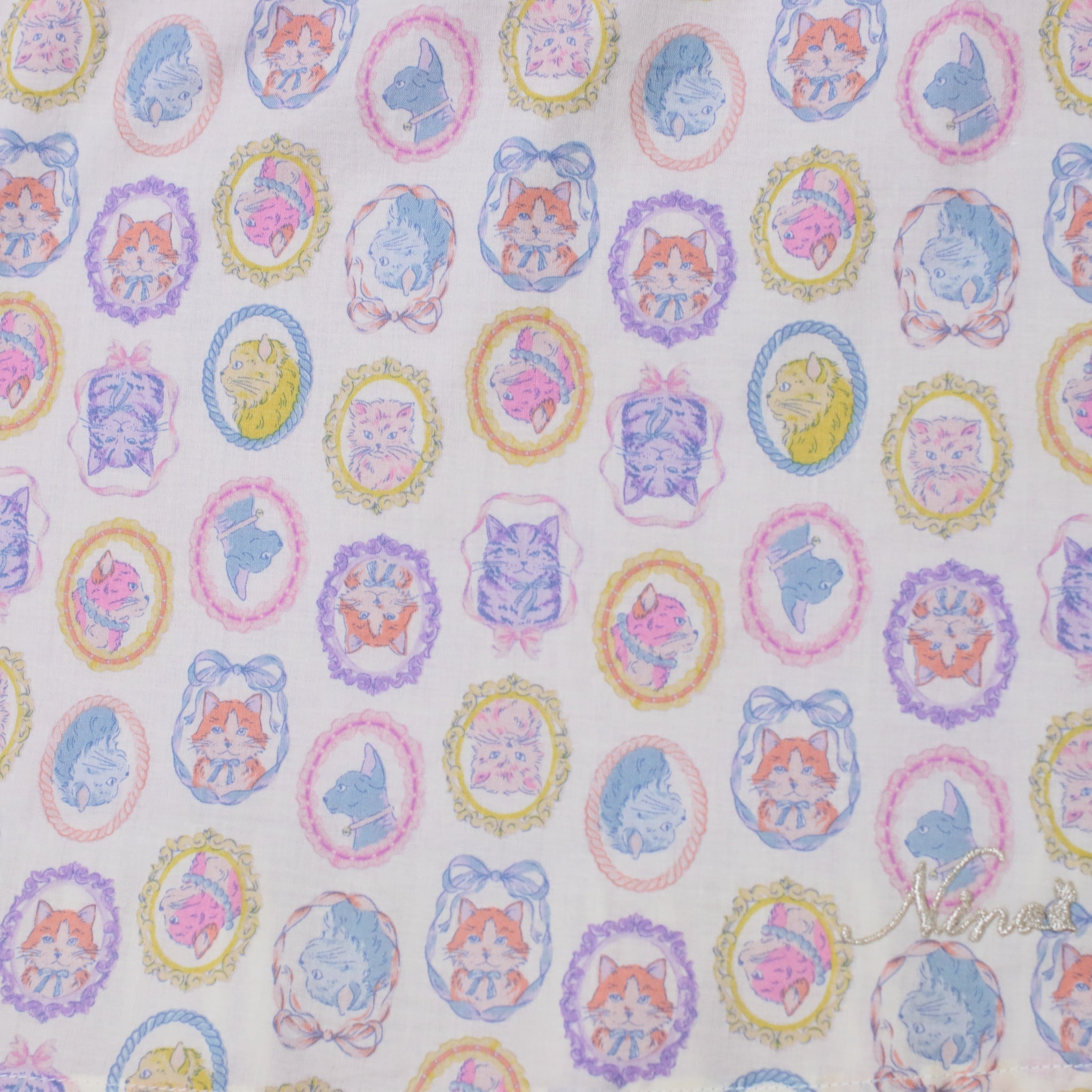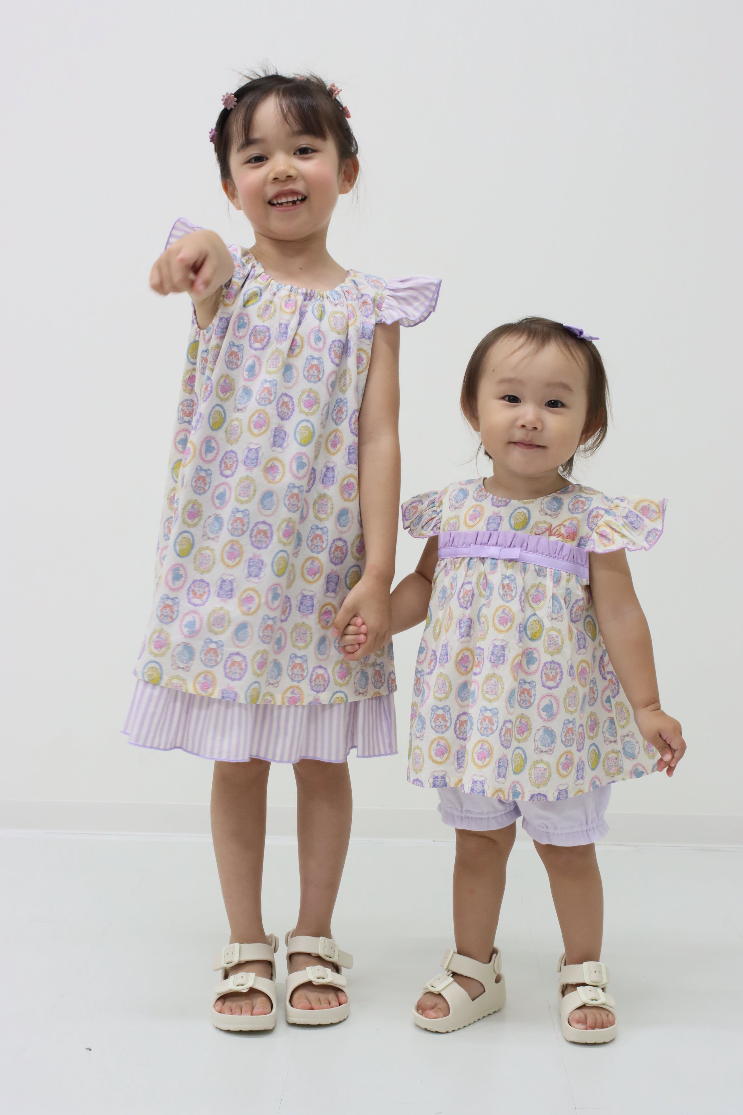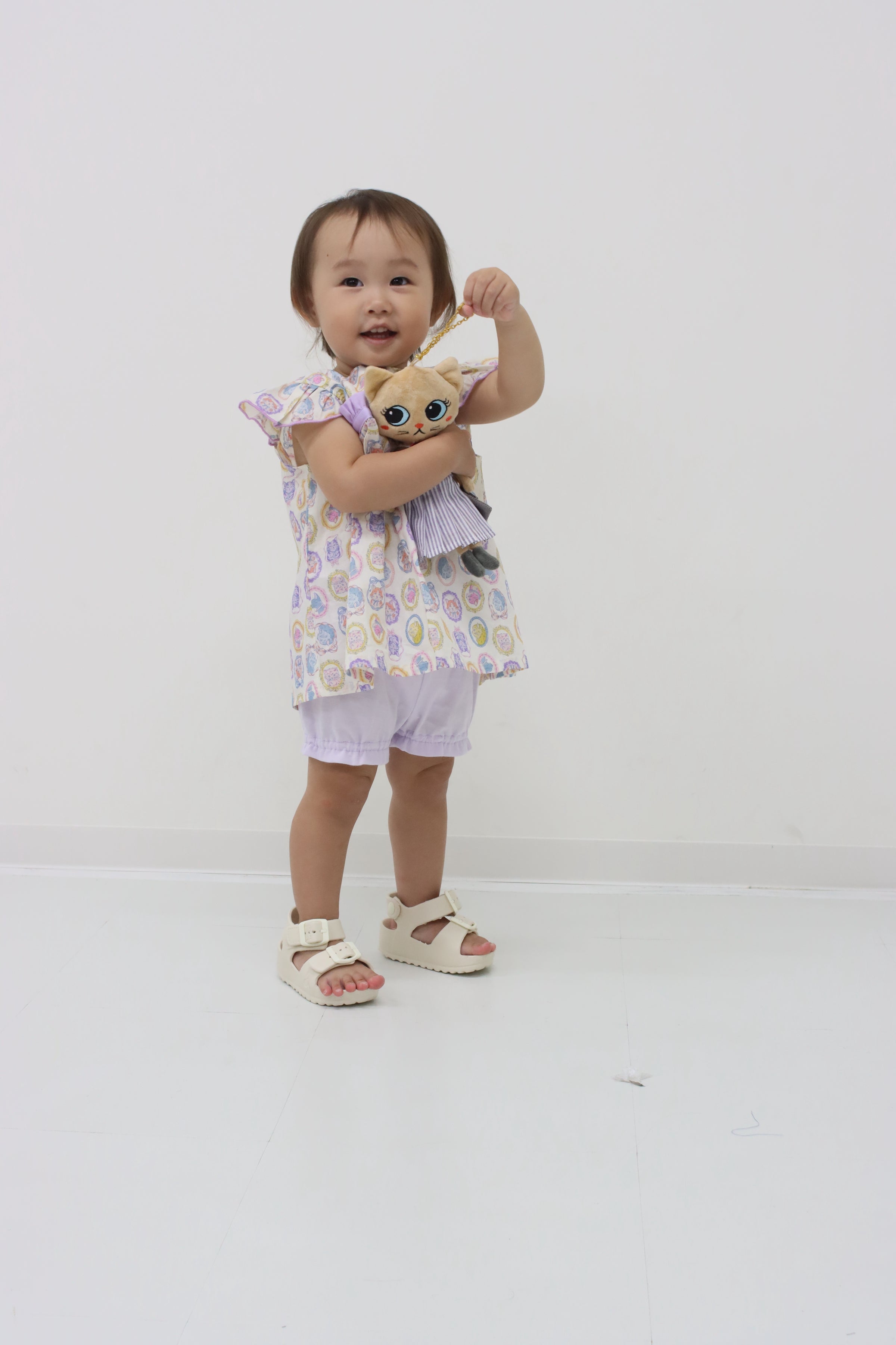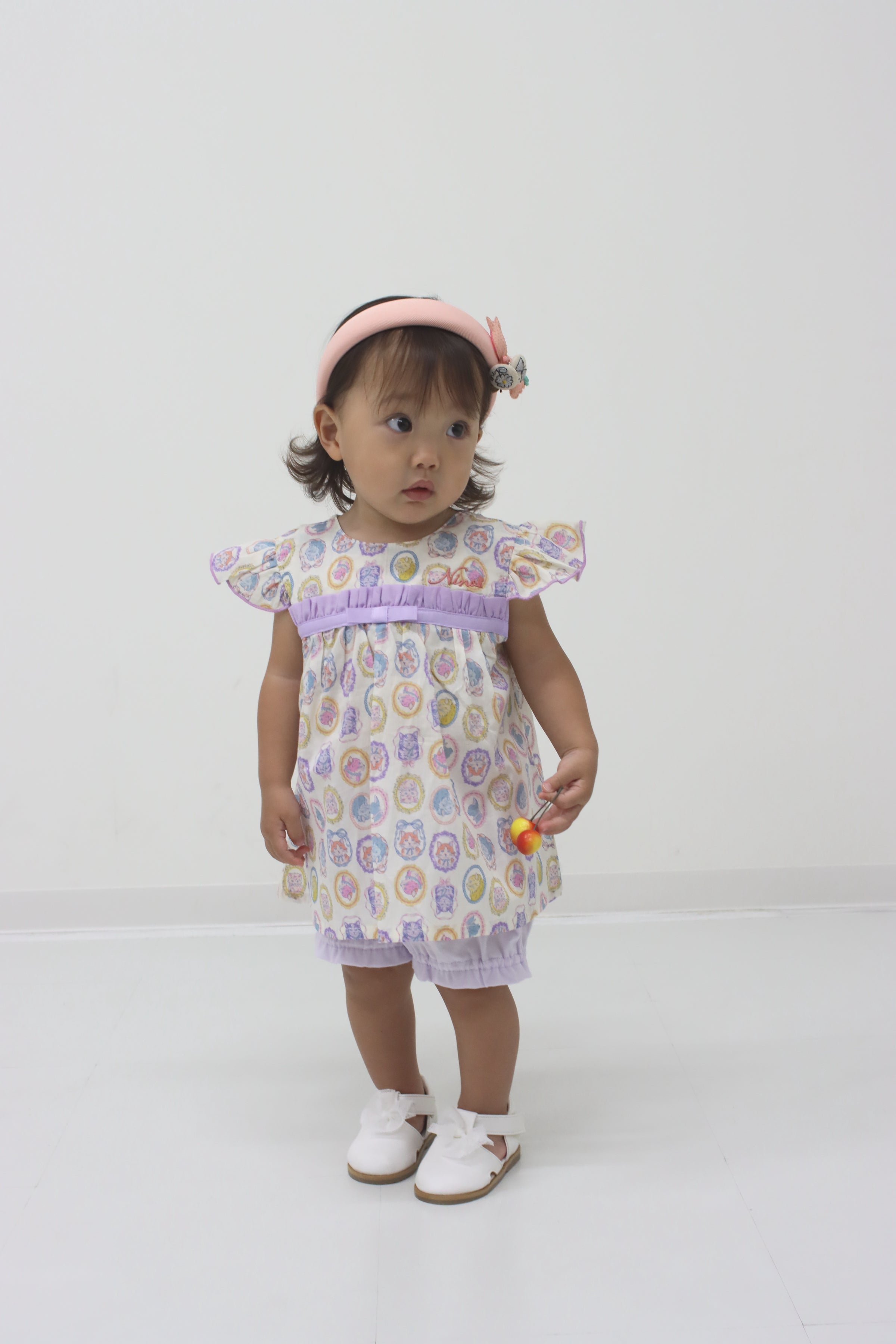 フレームに囲まれたネコちゃんモチーフがキュートで、お出かけスタイルもばっちり決まります!ブルマには伸縮性があるので、動きやすくてアクティブなベビーにもぴったり。プリント生地はややシアー感がありますので、インナーとのコーディネートも楽しめますよ。