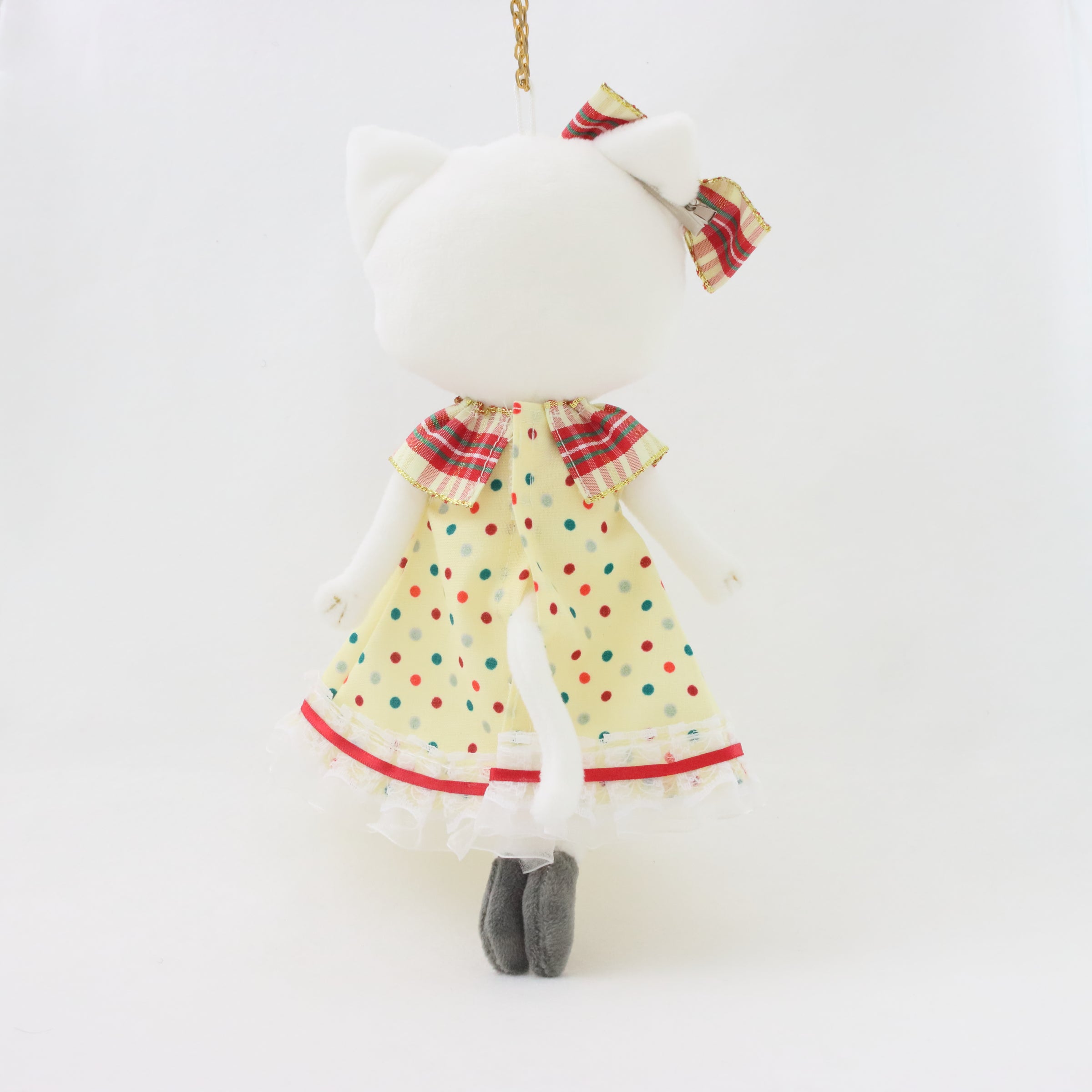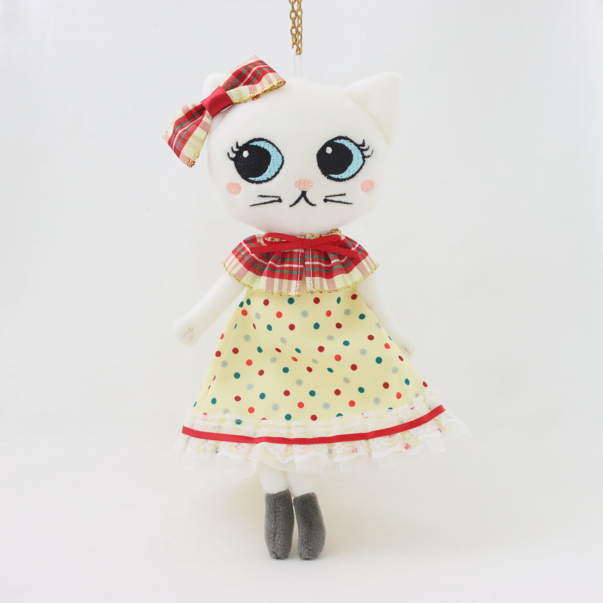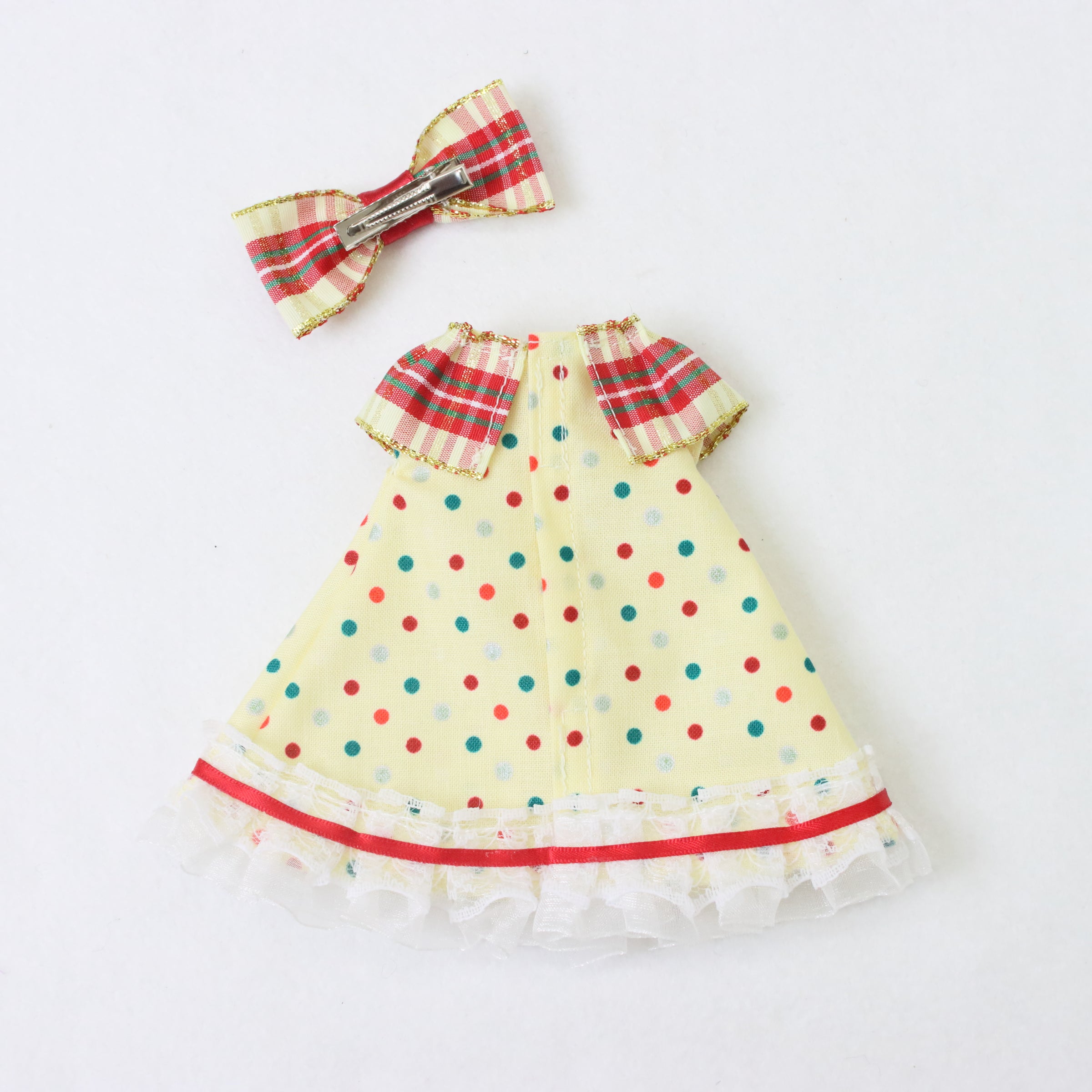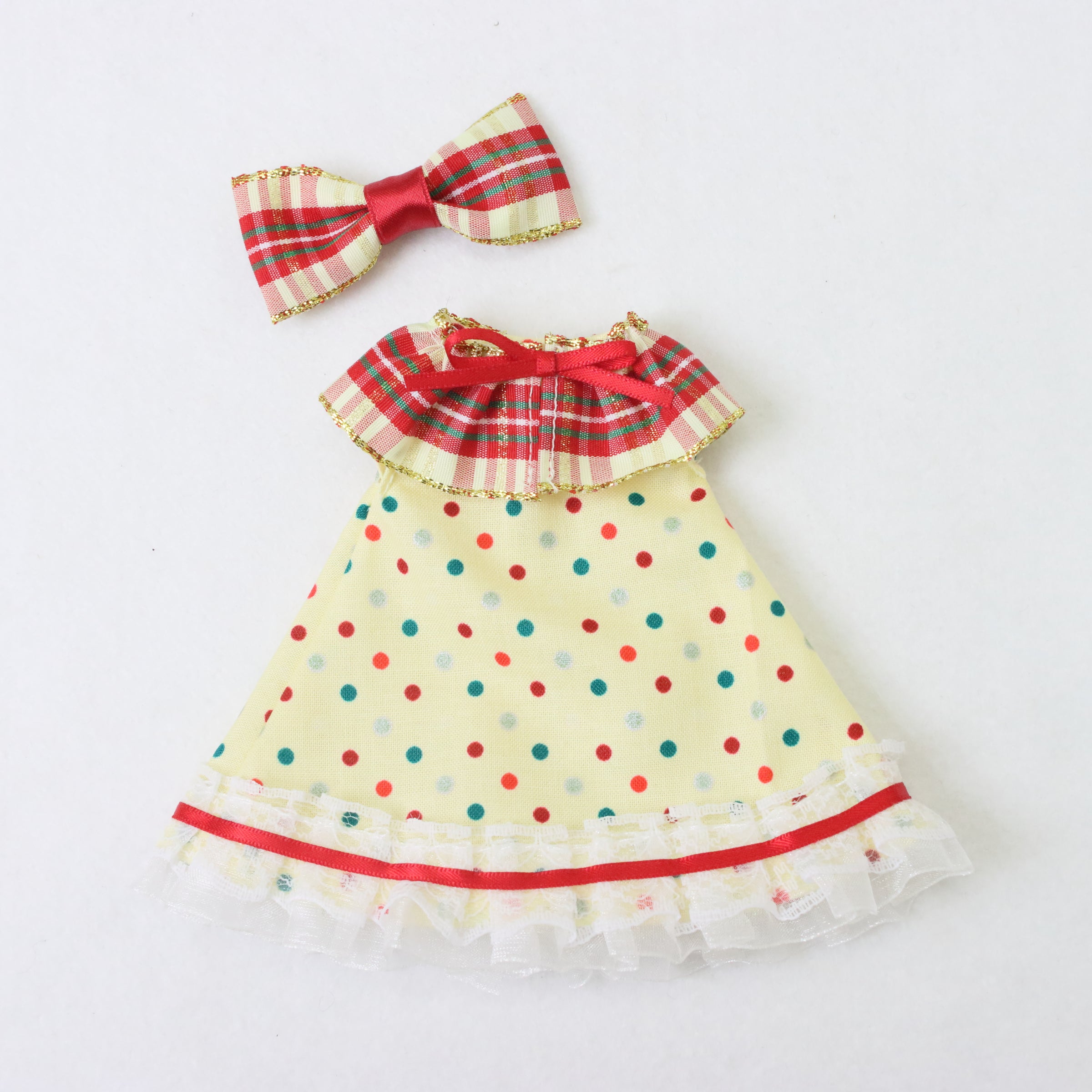 クリスマスカラーのドットが可愛いドレス。チェック柄の襟はふちがキラキラしていてクリスマスらしさを引き出しています。お揃いのリボン付きDETAILS