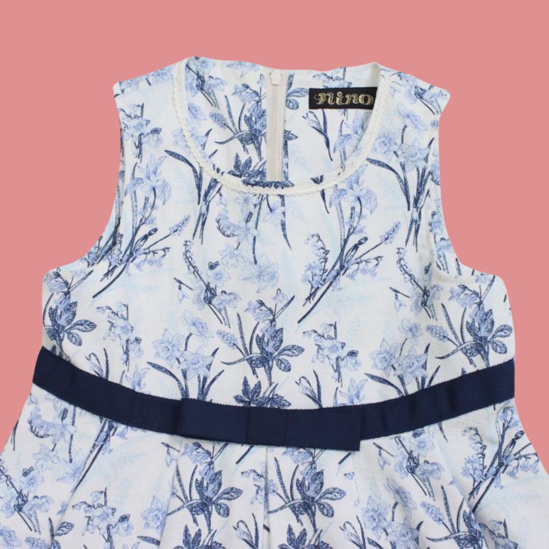 本商品は、清楚で洗練されたボタニカルプリントが施されたスカート部分と、シックなネイビーのトップスを組み合わせたデザインとなっております。