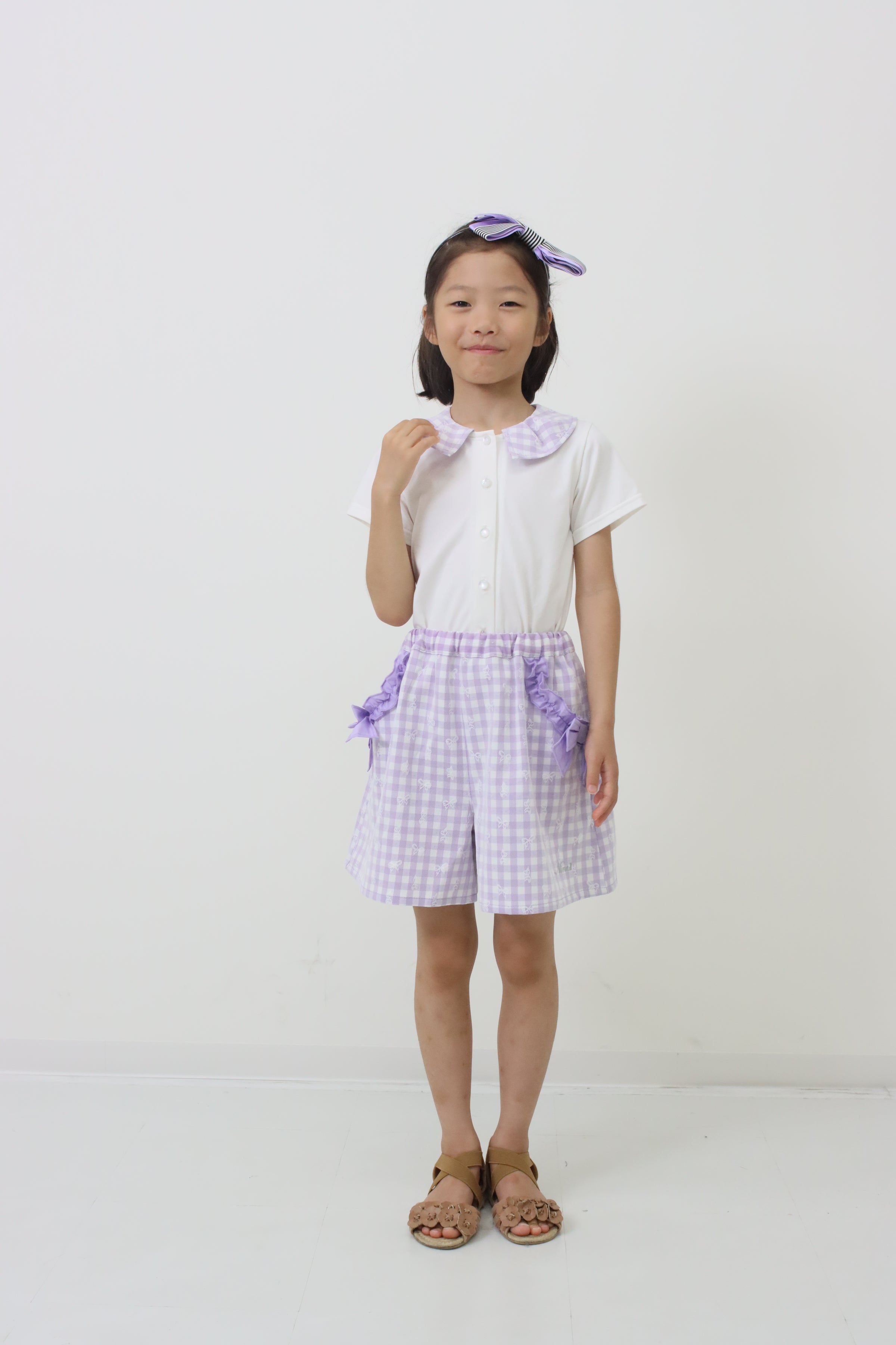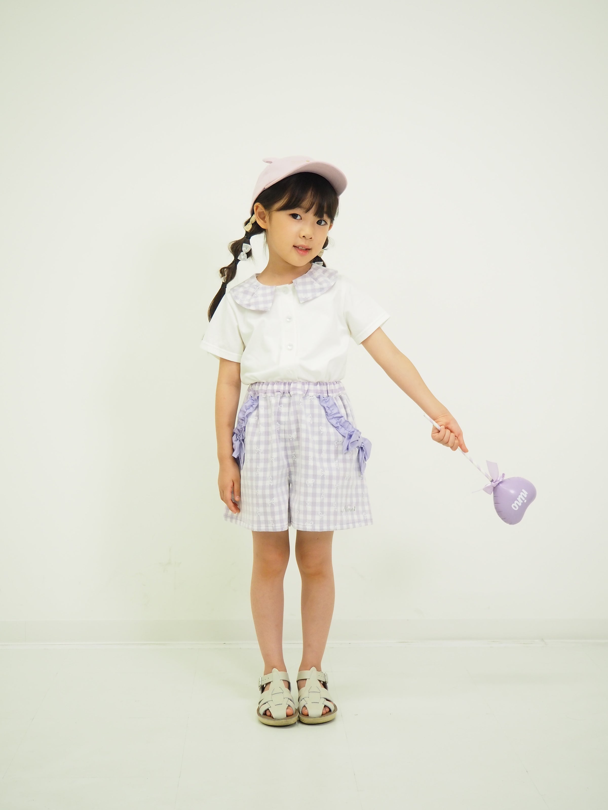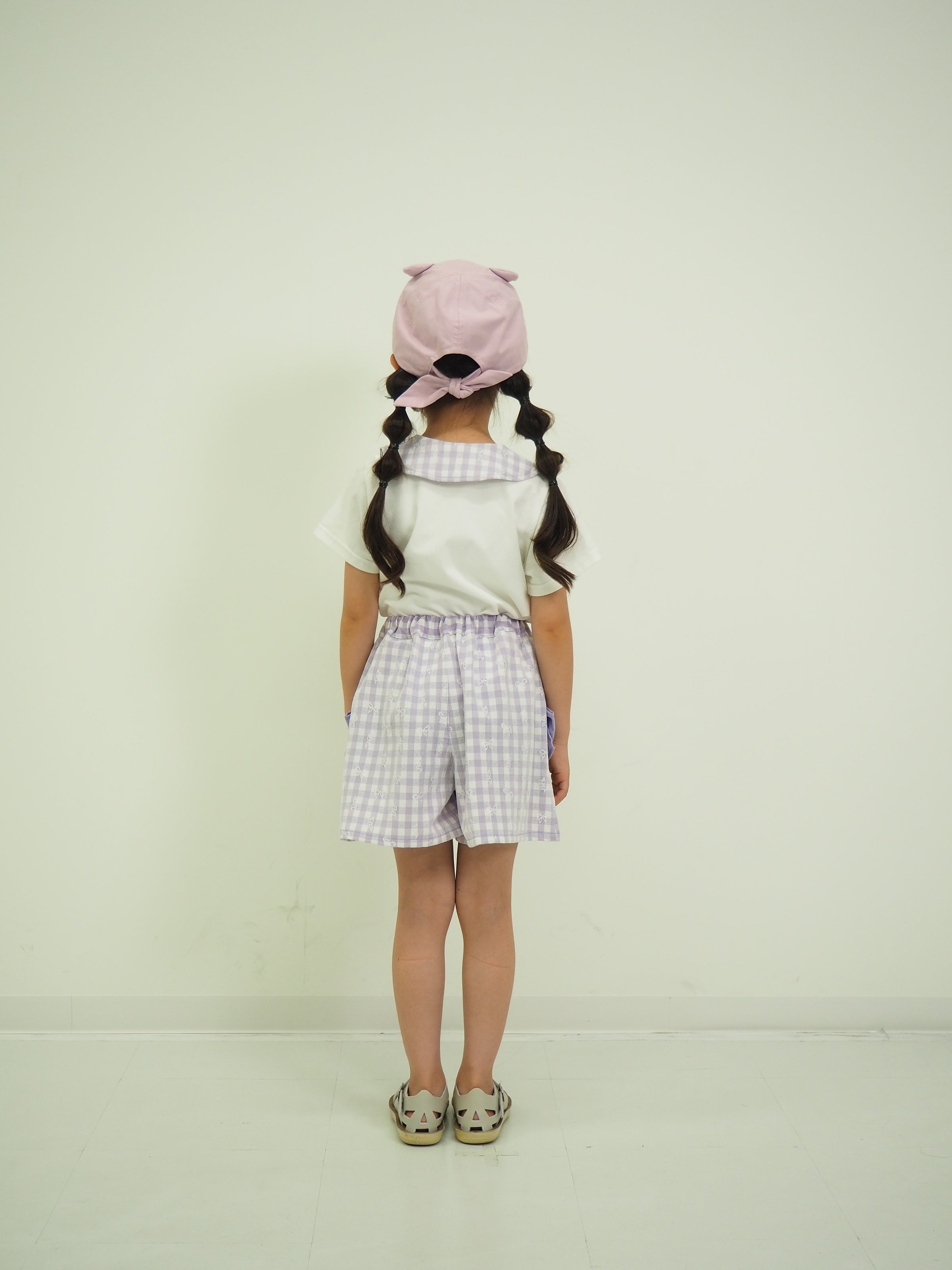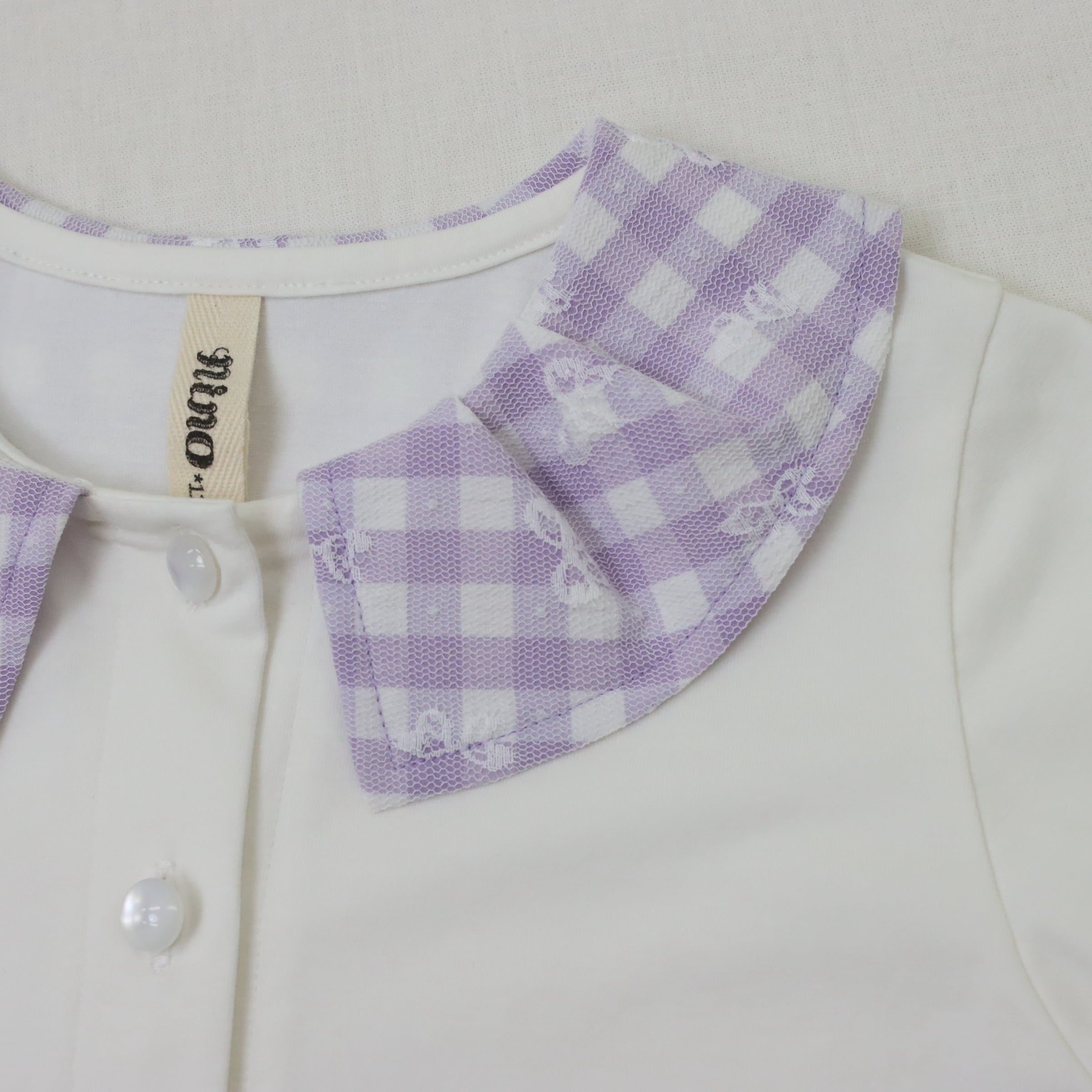 襟部分はギンガムチェック柄レースで、フェミニンな印象に仕上げています。