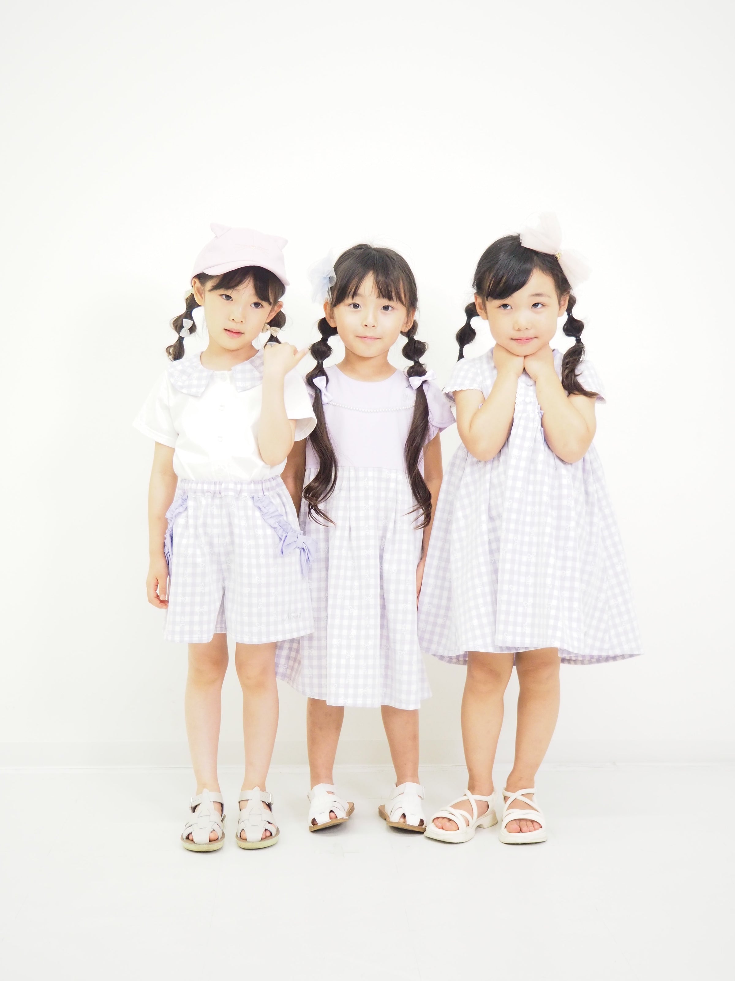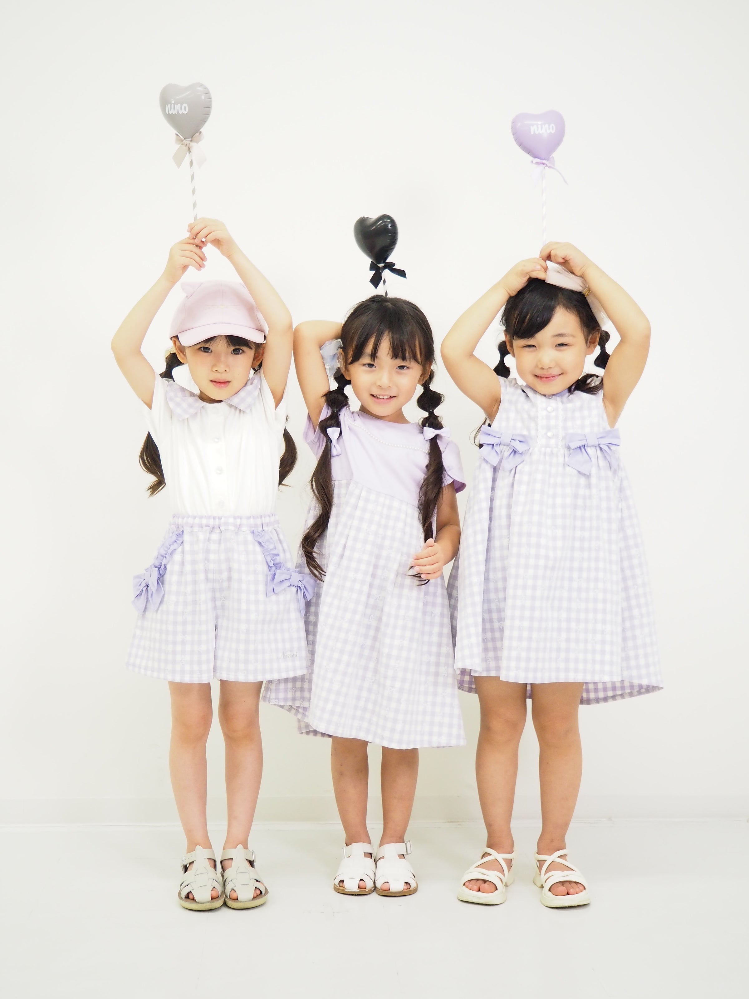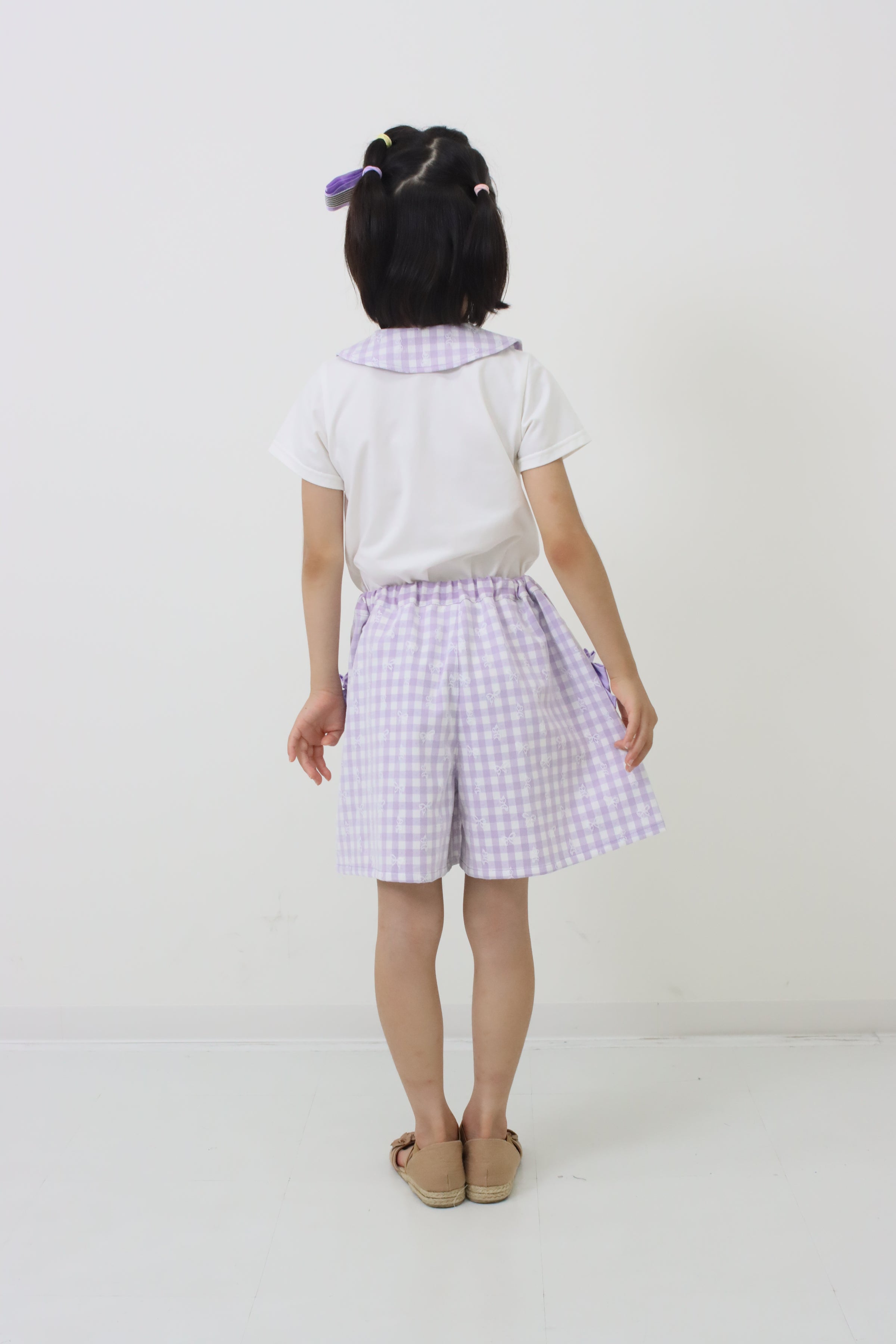 襟部分はギンガムチェック柄レースで、フェミニンな印象に仕上げています。