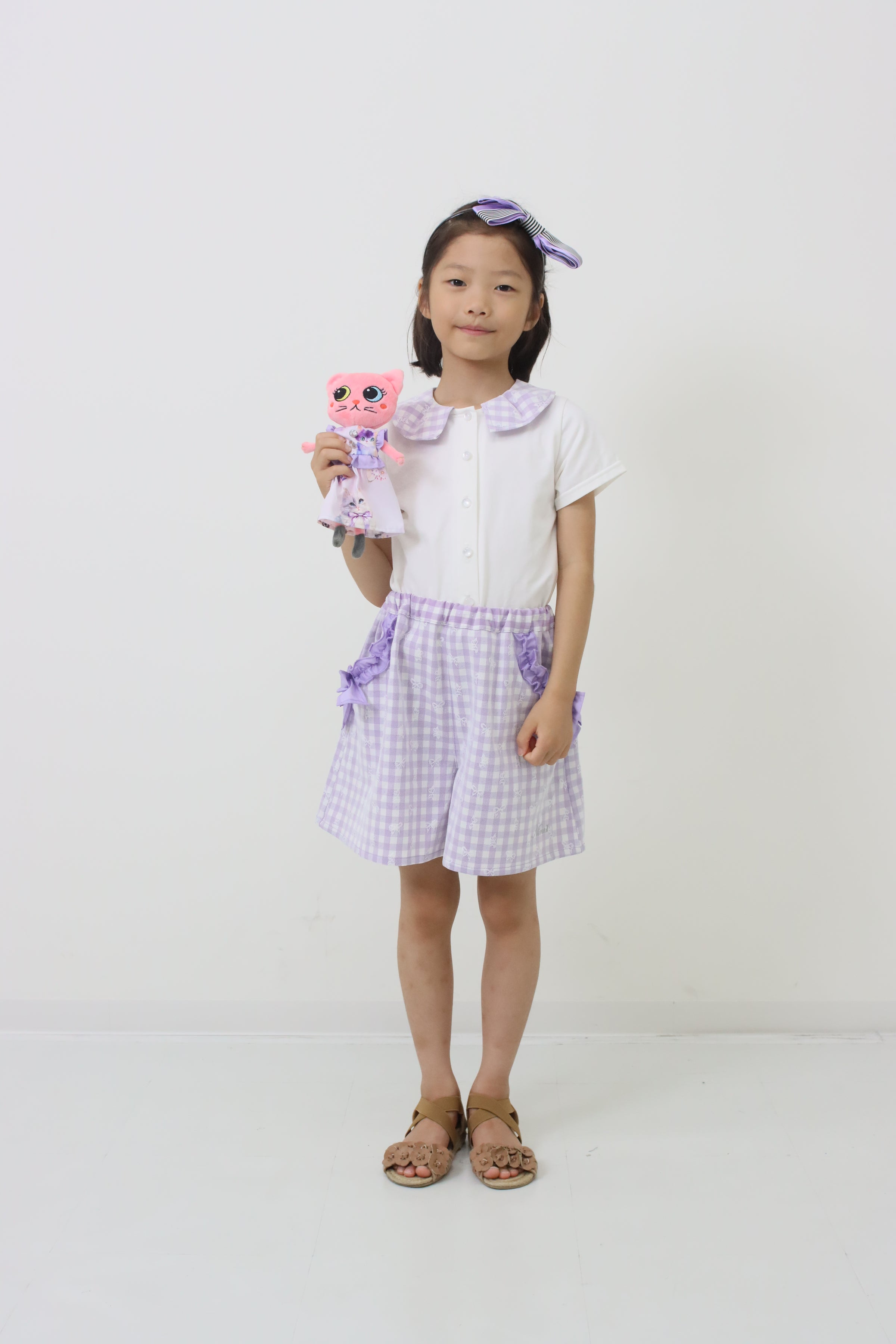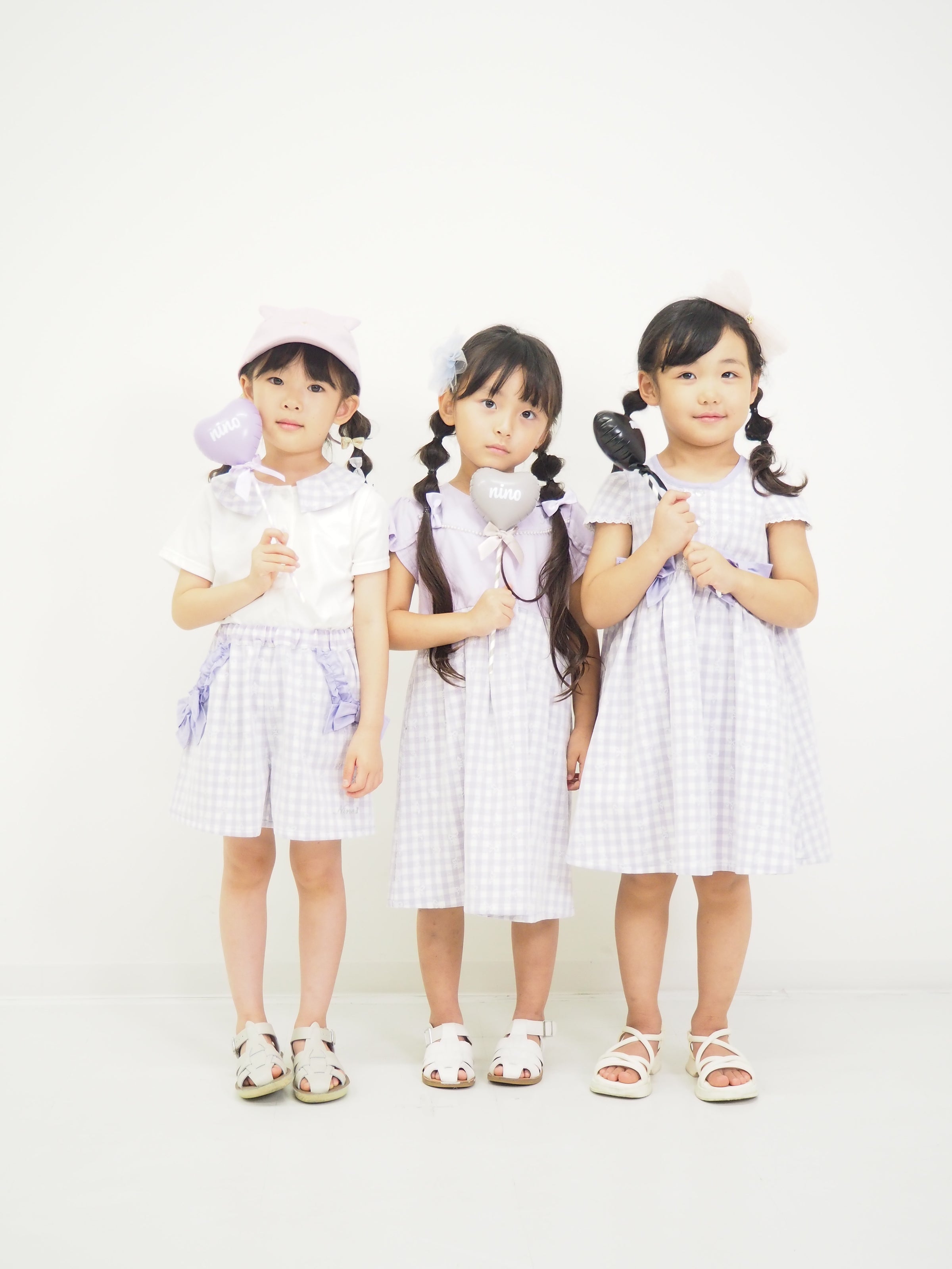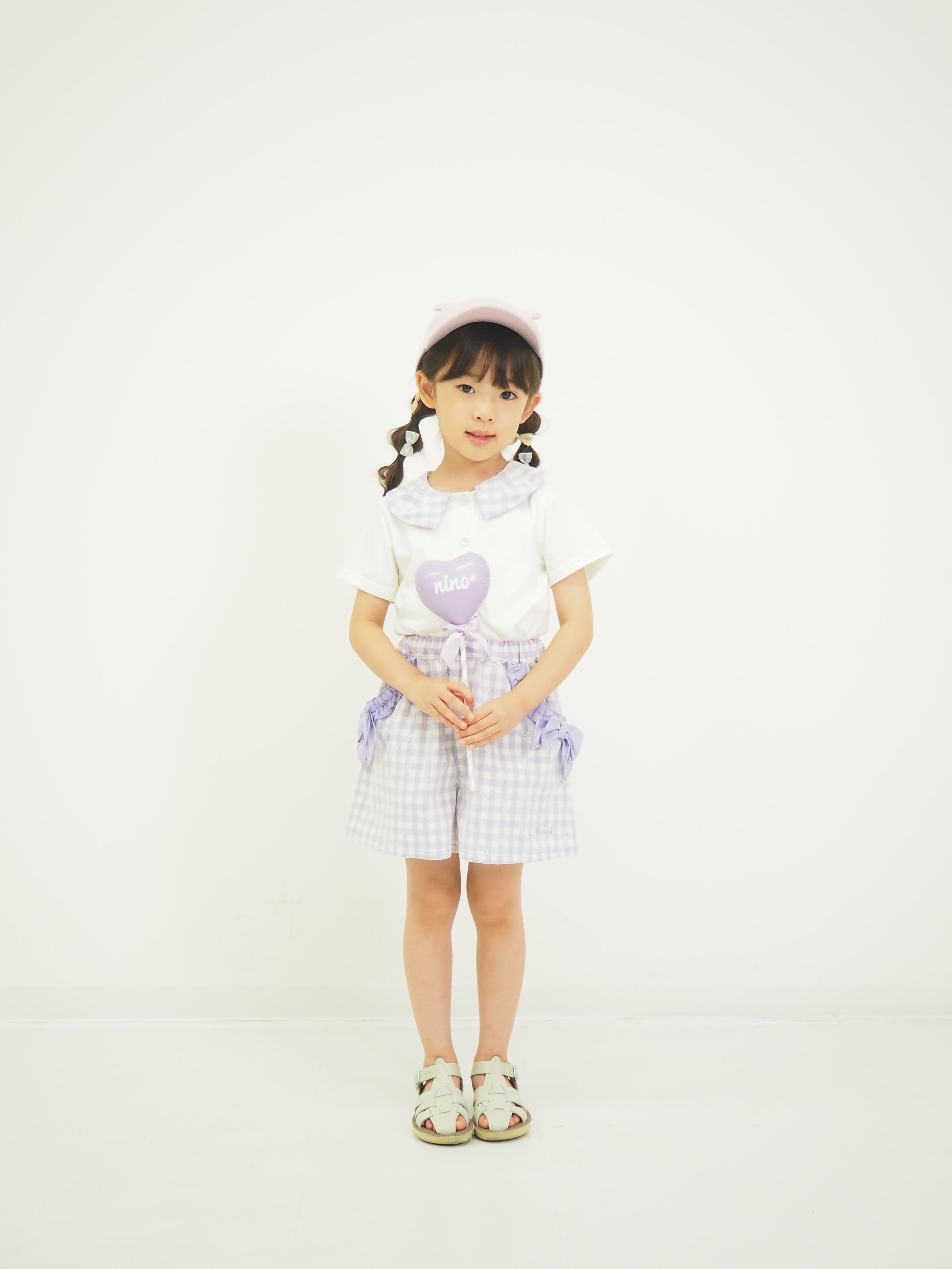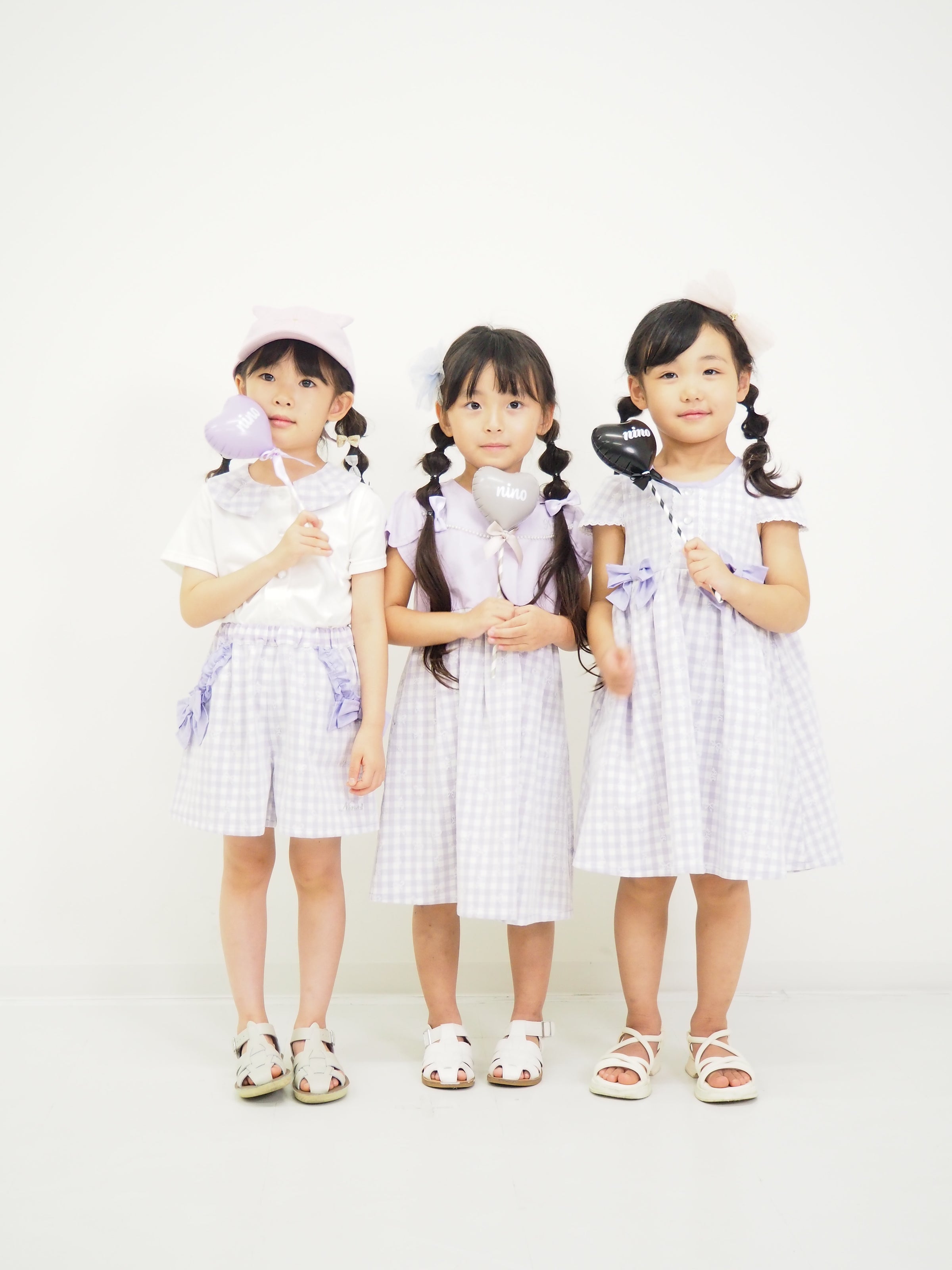 襟部分はギンガムチェック柄レースで、フェミニンな印象に仕上げています。