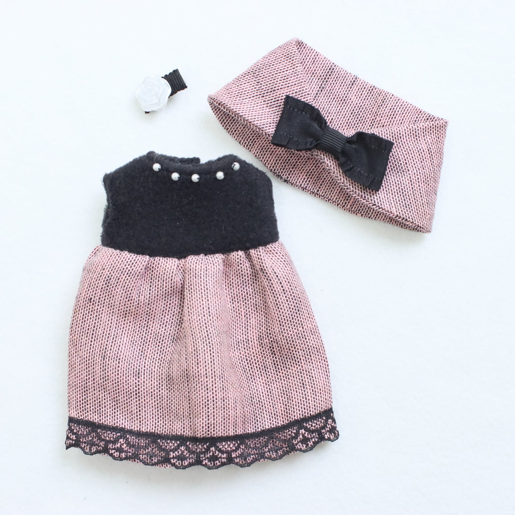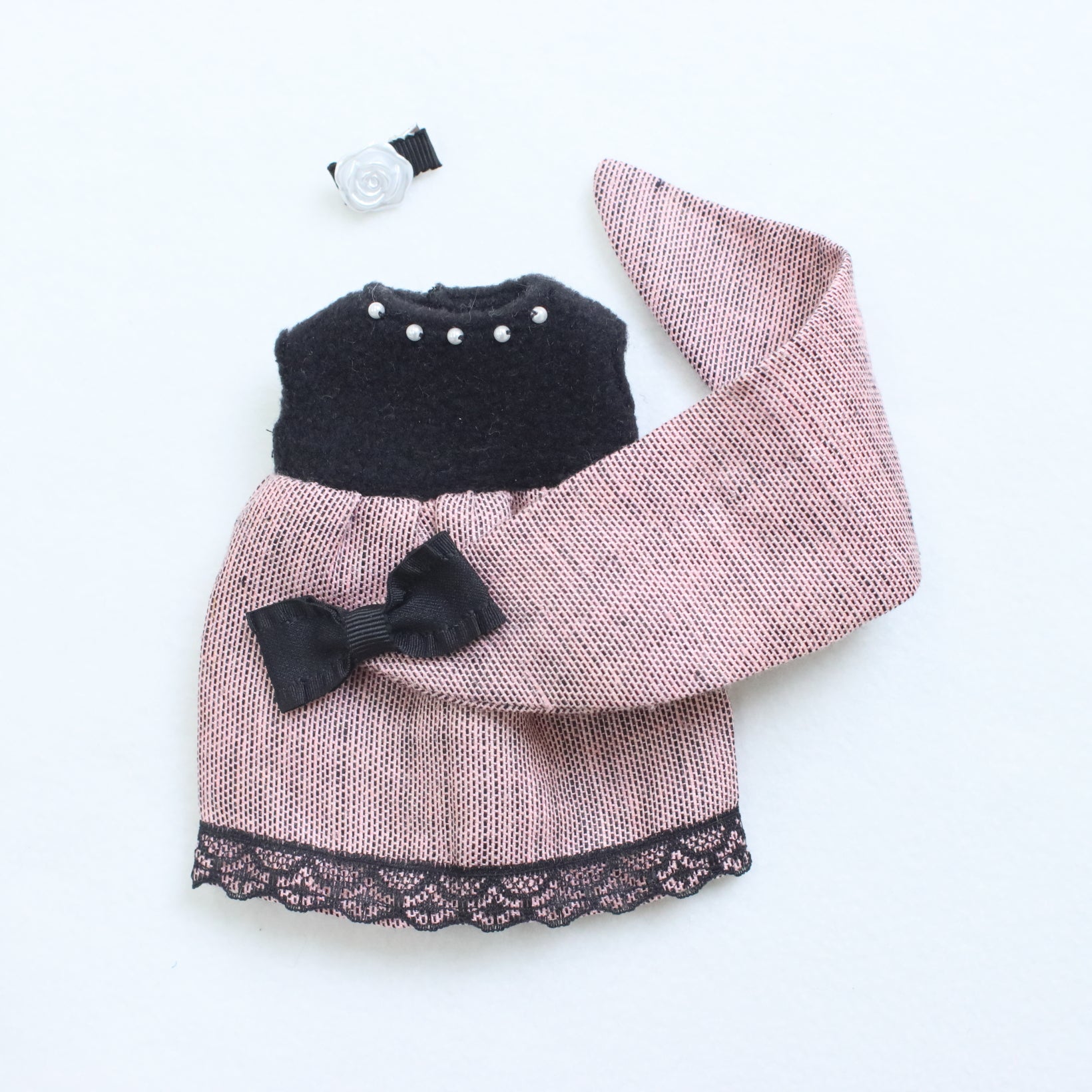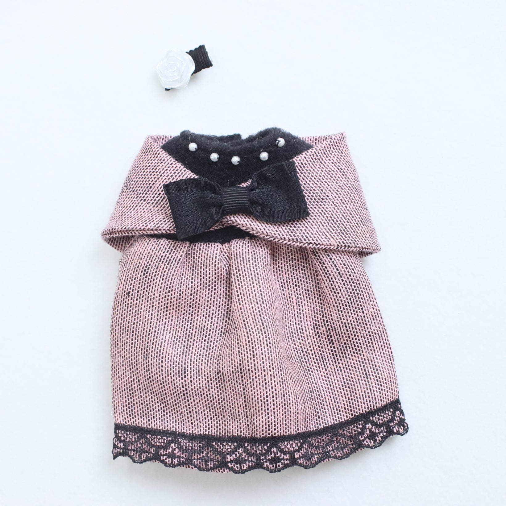 ピンクと黒で大人可愛いおめかしワンピース。首元のパールや裾のレースで上品な印象に。リボンが付いたショールとバラのヘアアクセ付きDETAILS