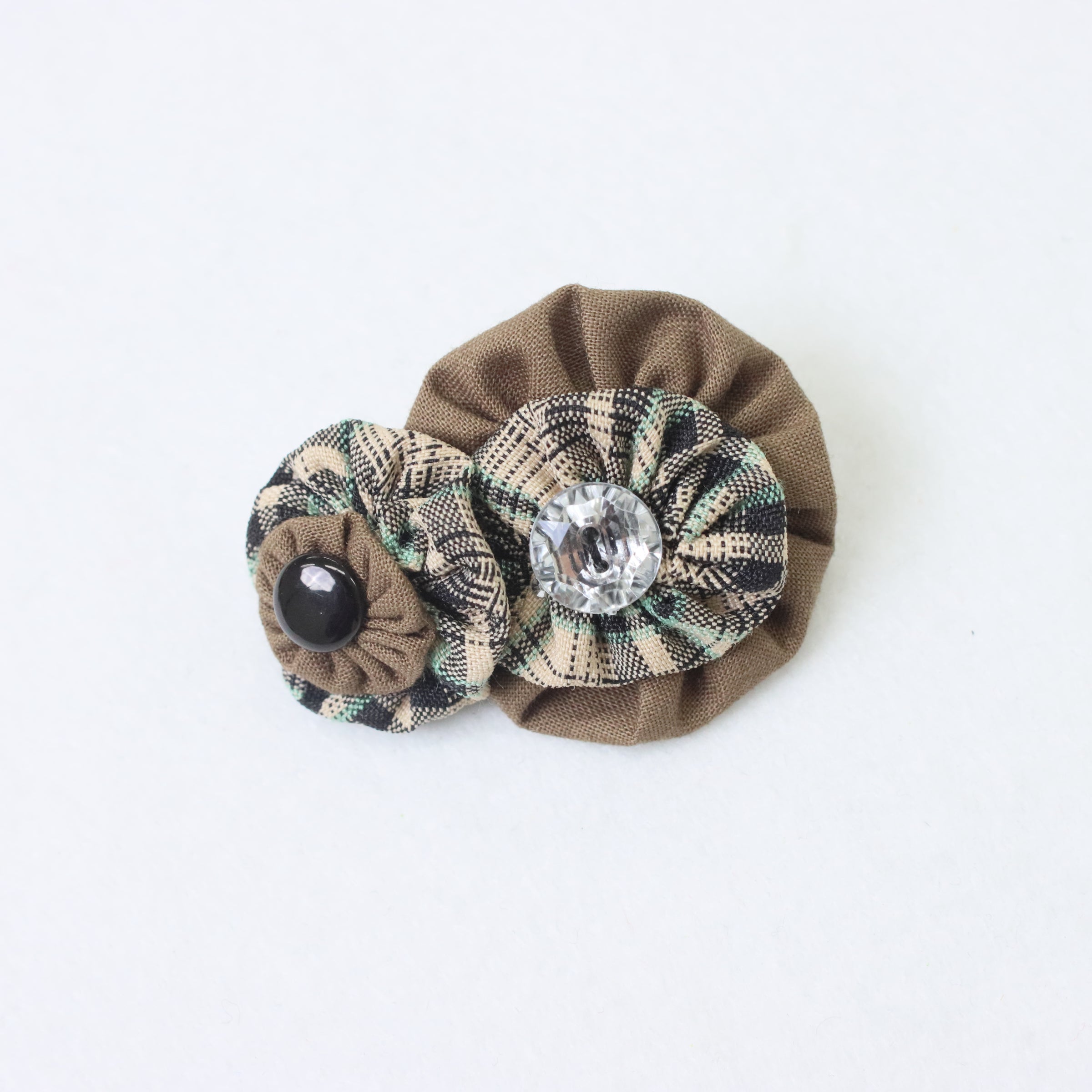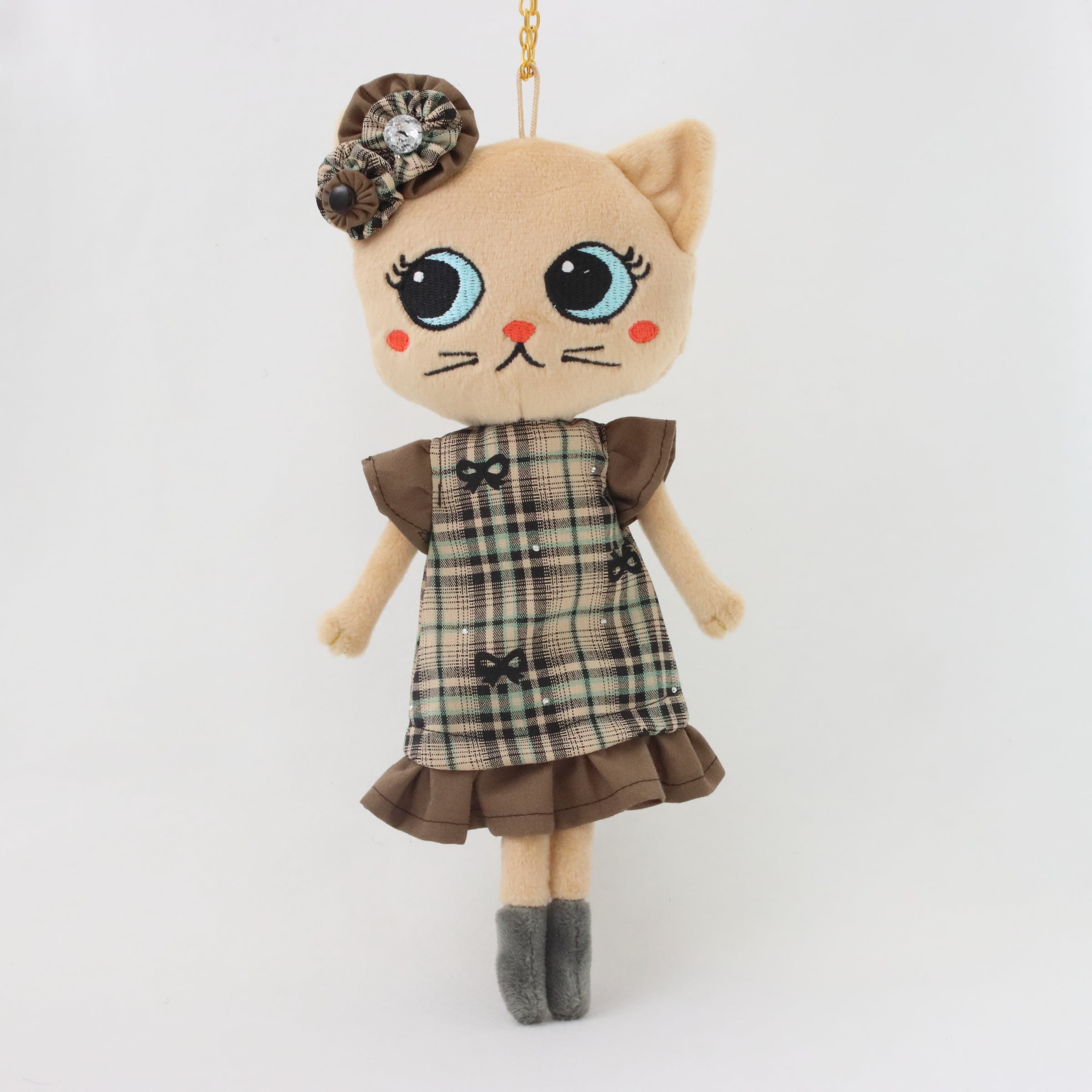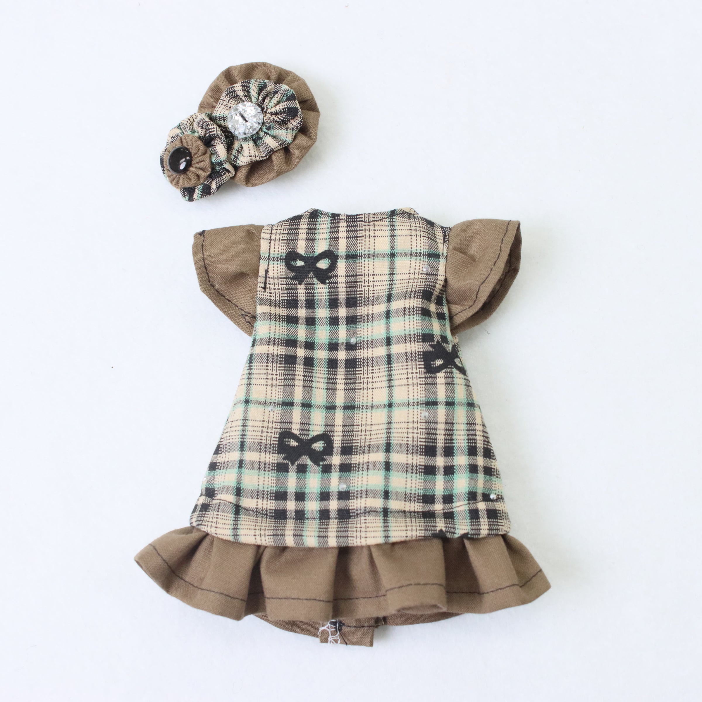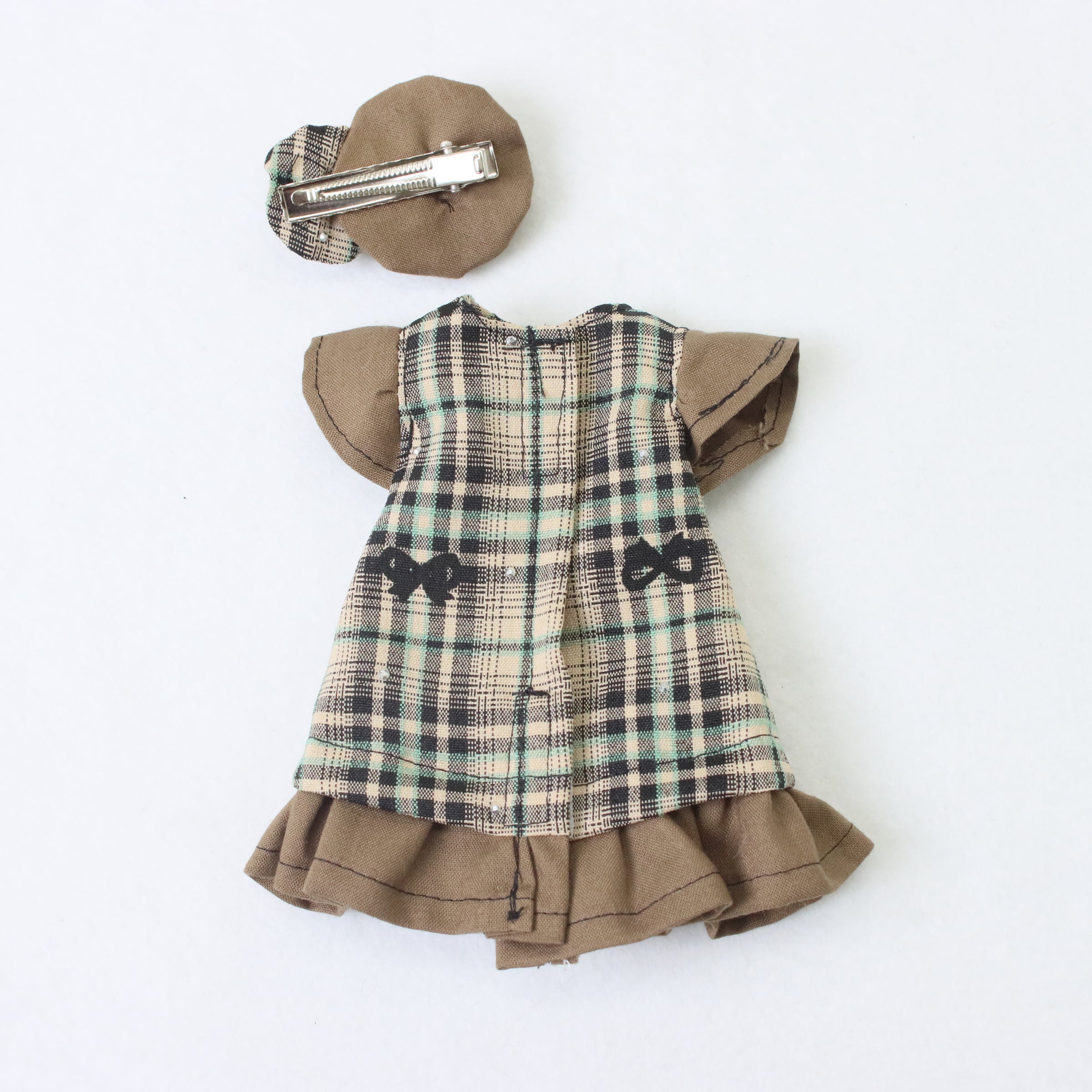 ラインストーンがキラッと光るリボンチェックのワンピース。秋冬らしいブラウンにグリーンの配色がキュート♪ninoのお洋服とのリンクコーデができる特別なデザイン。お揃いのヘアアクセ付きDETAILS