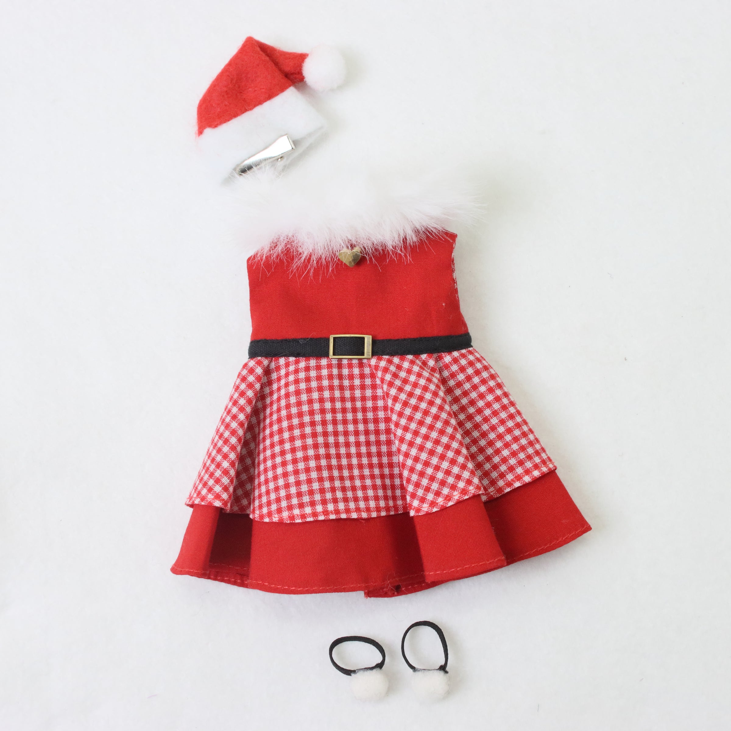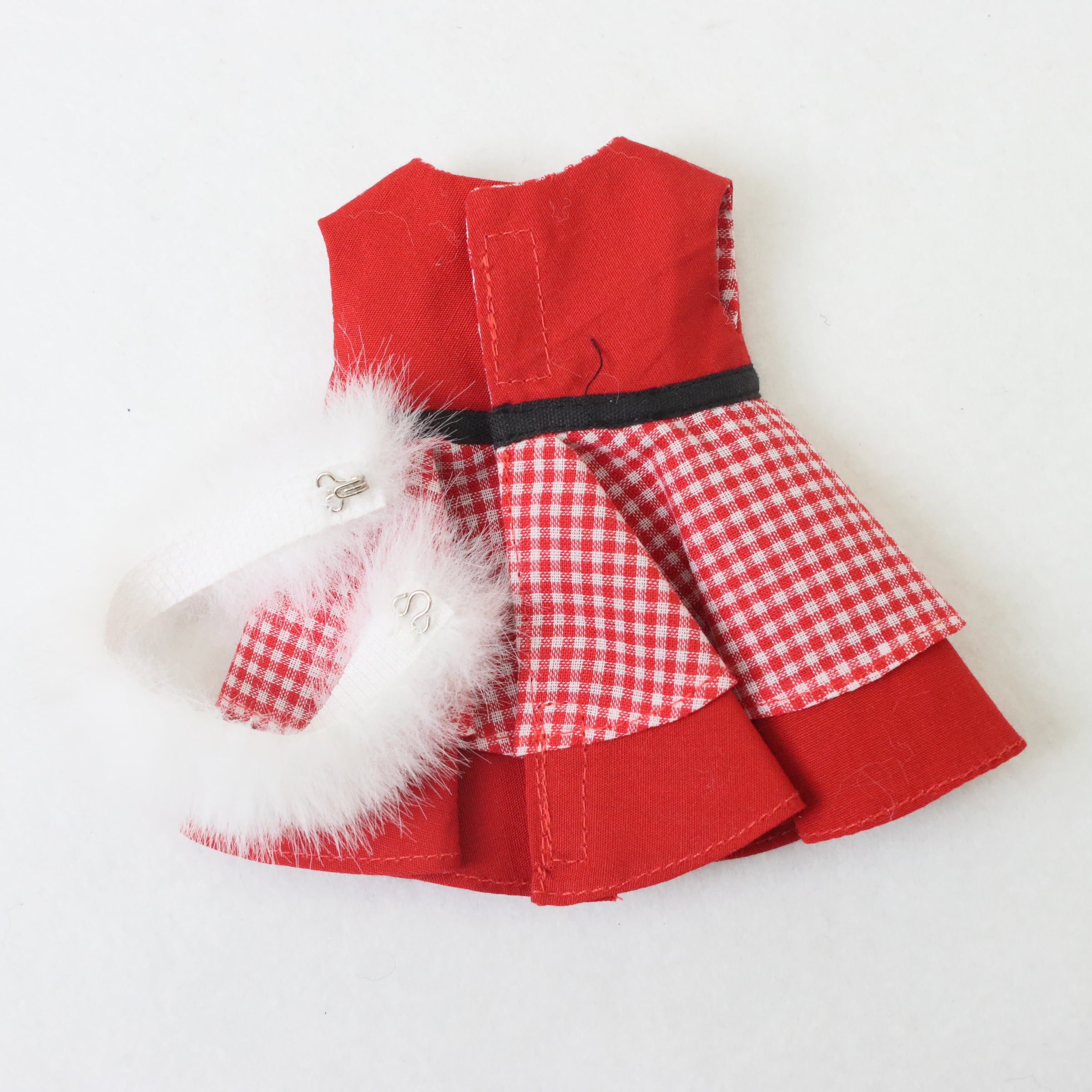 サンタのミニ帽子に足元にはポンポン、首元のファーのマフラーにギンガムチェックがレトロ可愛いドレスの4点セット!サンタコーデでクリスマスをエンジョイするニャ♬DETAILS