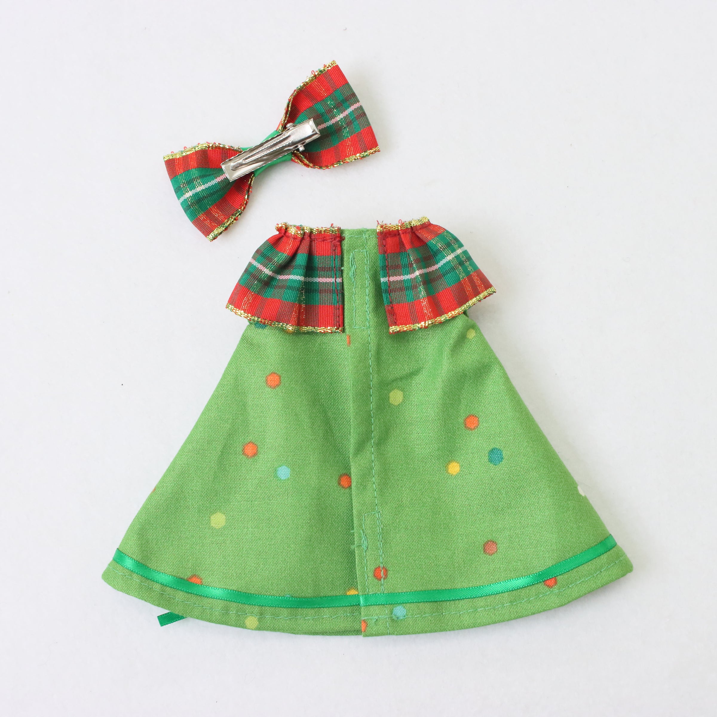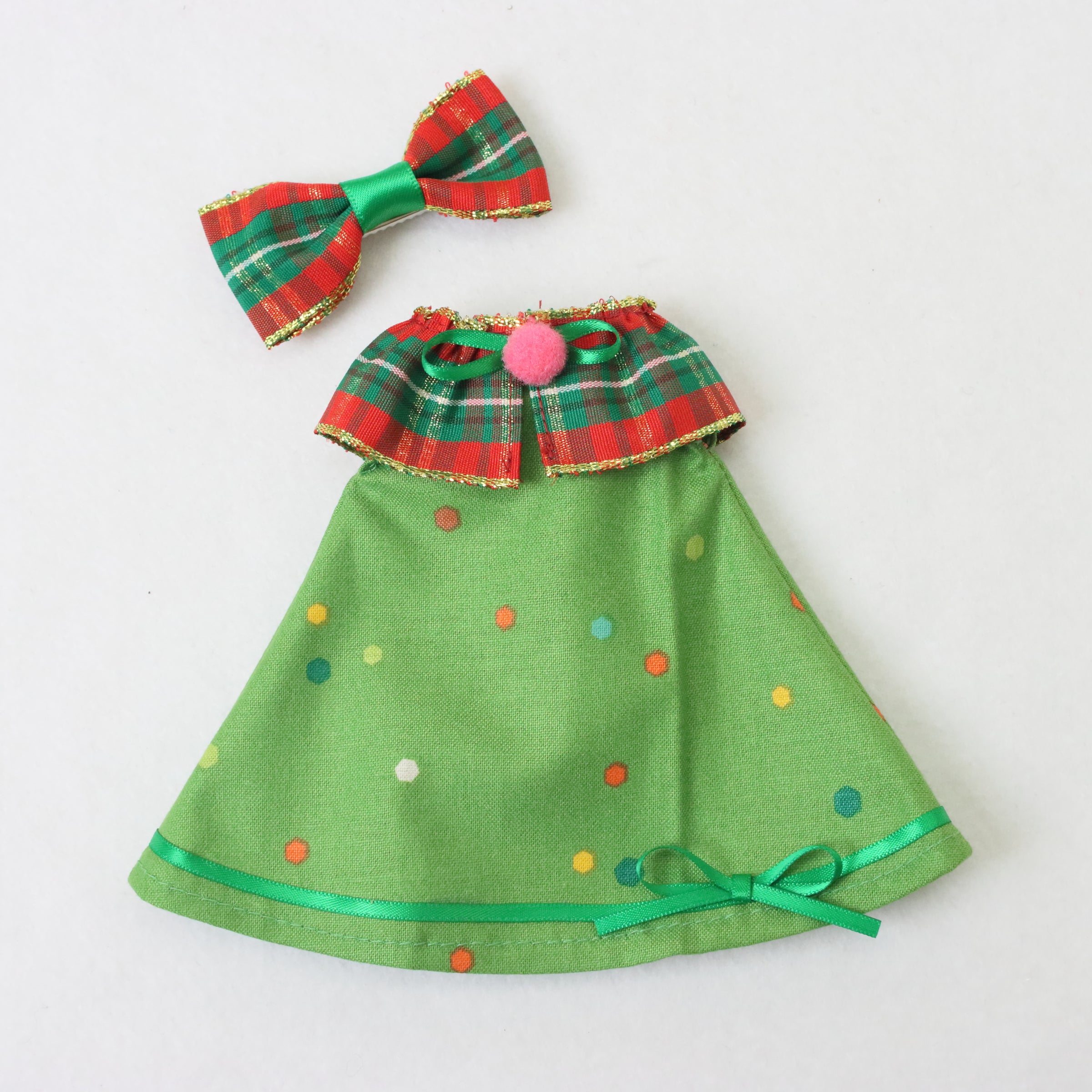 カラフルなドットがキュートなクリスマスドレス。裾のリボンや胸元のポンポンの付いたリボンもポイント!お揃いのリボン付きDETAILS