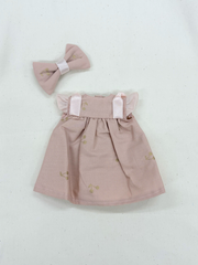 優しいピンクにさりげなくプリントされたチェリー柄が可憐な印象ワンピース♬ お揃いのリボン付き。 ninoの子供服とのリンクコーデもできる特別なデザインDETAILS
